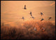 Plakat av to ender som flyr over stille vann og i et nydelig solnedgangslys