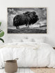 • Etter printing spennes lerretsduken på en kraftig blindramme. For de fleste formatene bruker vi en 40mm tykk ramme, slik at det oppnås en flott dybde-effekt når rammen henges på veggen. Deretter monterer vi på oppheng med stålvaier og kunstverket ditt kan henges rett på vegg.