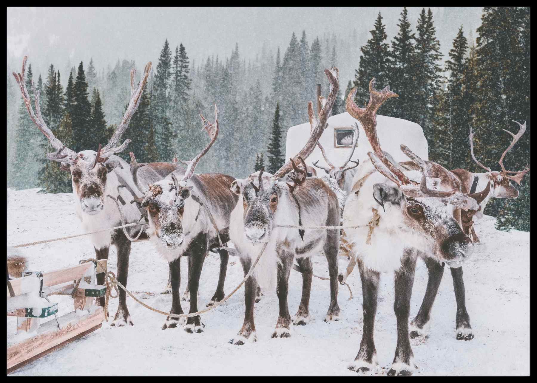 Et flott vintermotiv av en reinsdyrflokk. Denne plakaten passer svært godt på en bildevegg sammen med våre andre vinterplakater.