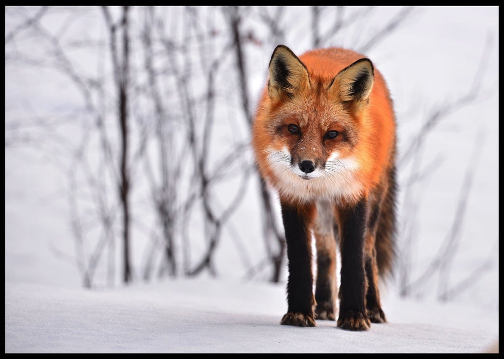 Plakat med en vakker rødrev som kommer gående over snødekt mark.