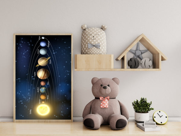 En stilig poster hvor barna kan lære seg de forskjellige navnene på planetene i vårt solsystem. En perfekt plakat å ha på soverommet til barn som både er opptatt av verdensrommet, og som vil ha noe stilig på veggen.