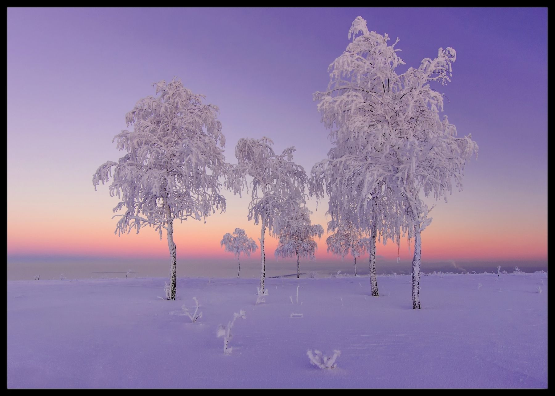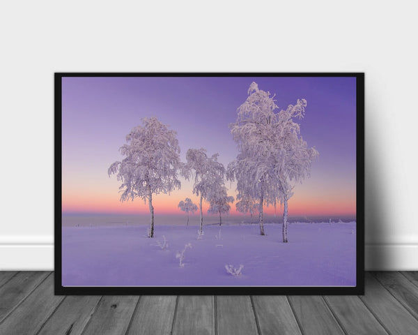 Plakat av en flott vinterstemning med frosne trær og solnedgang.