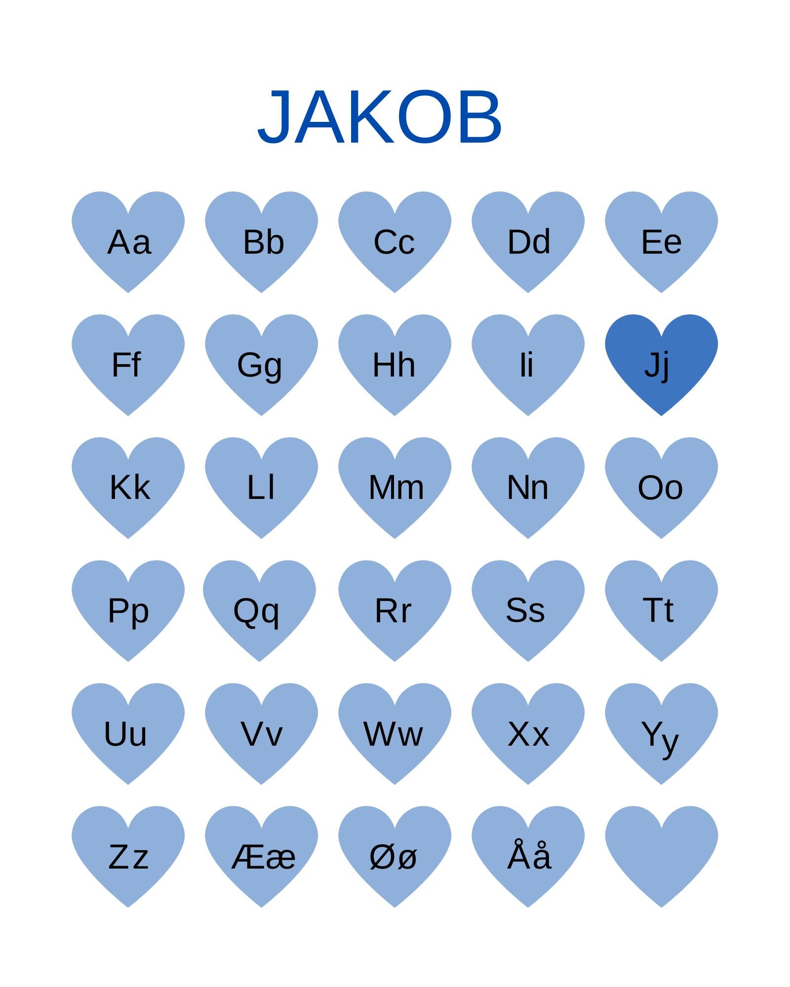 En fin ABC-alfabetplakat med ett tydelig markert hjerte på forbokstaven til barnet. Her er både store og små bokstaver, perfekt til skolestart.