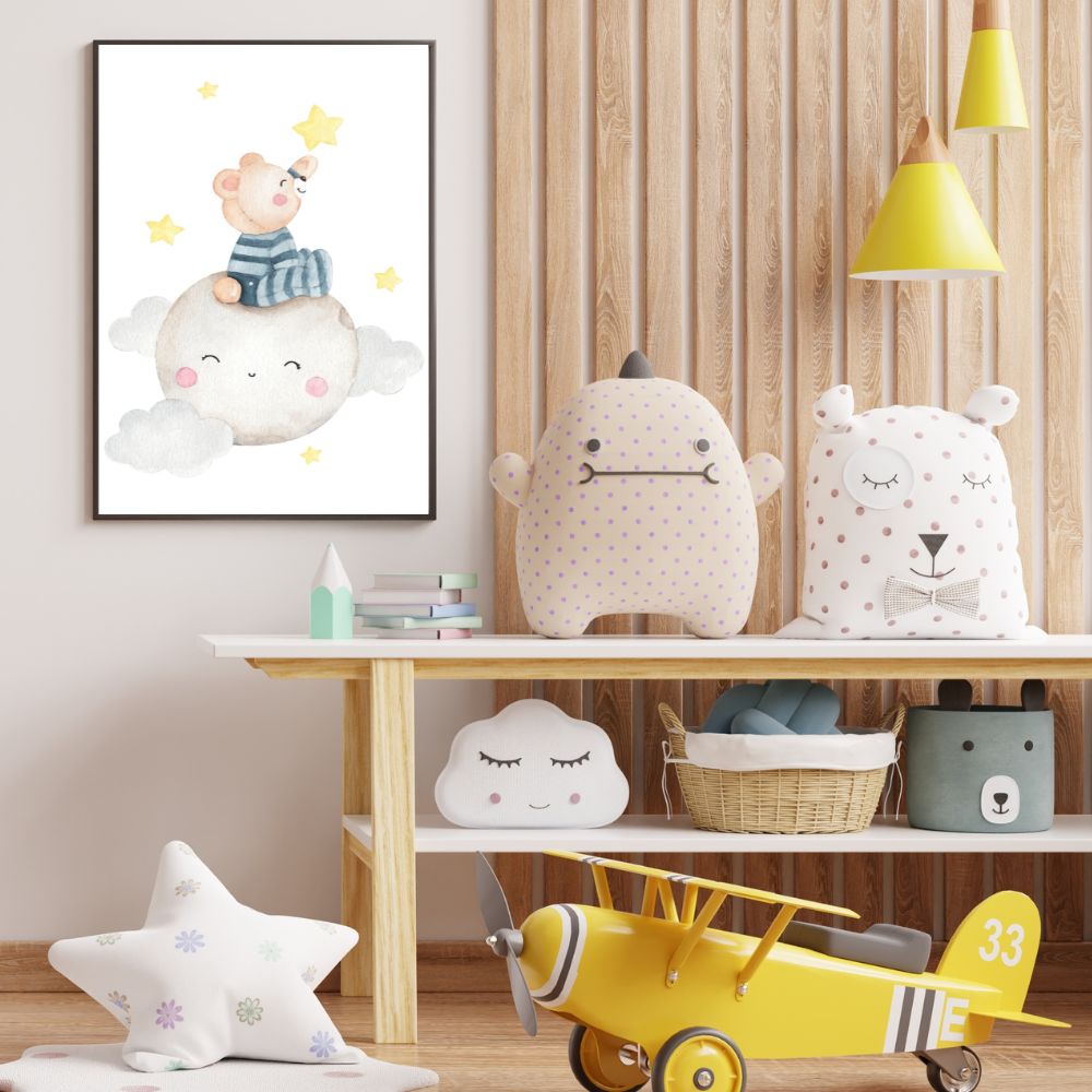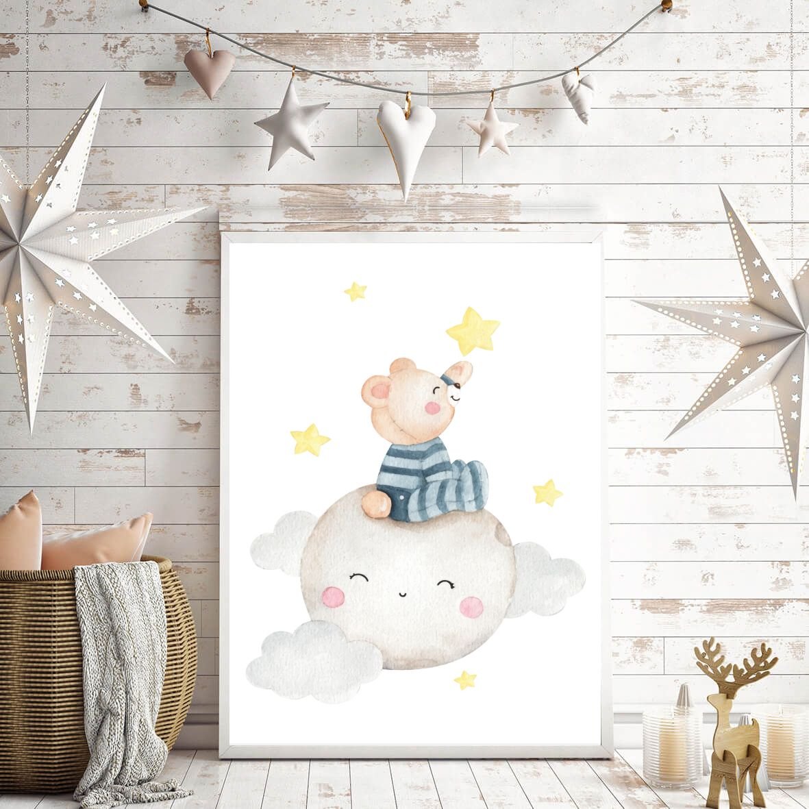 En nydelig plakat til barnerommet av en bamse som sitter på månen og ser på stjernene. Passer godt sammen med våre andre plakater til barnerommet.