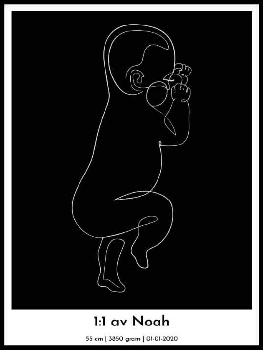 1:1 plakatene selges i størrelsen 50x70 og babyen på plakaten har den eksakte lengden som barnet ditt hadde ved fødsel.