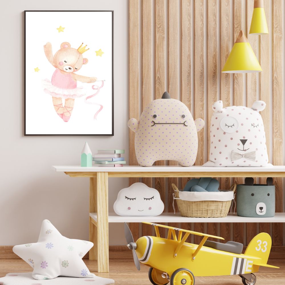 Supersøt plakat av en dansende bamse med krone og skjørt, perfekt til barnerommet.