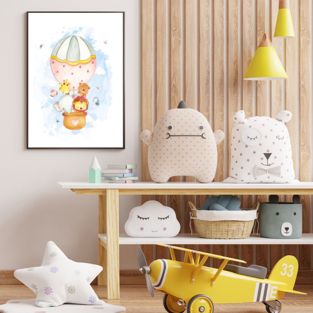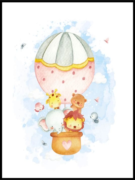 Supersøt plakat av forskjellige dyr som sitter i en luftballong, perfekt til barnerommet.