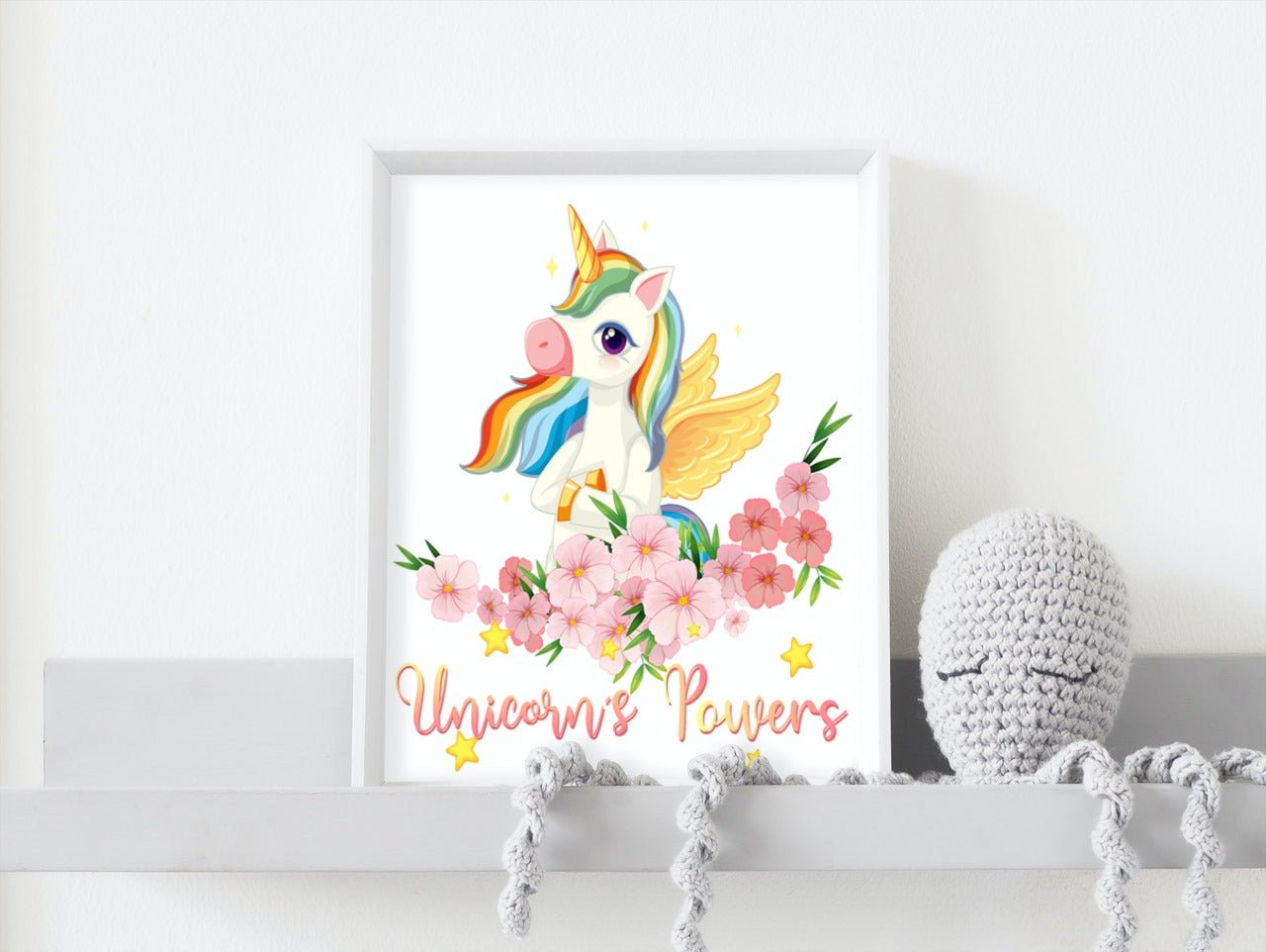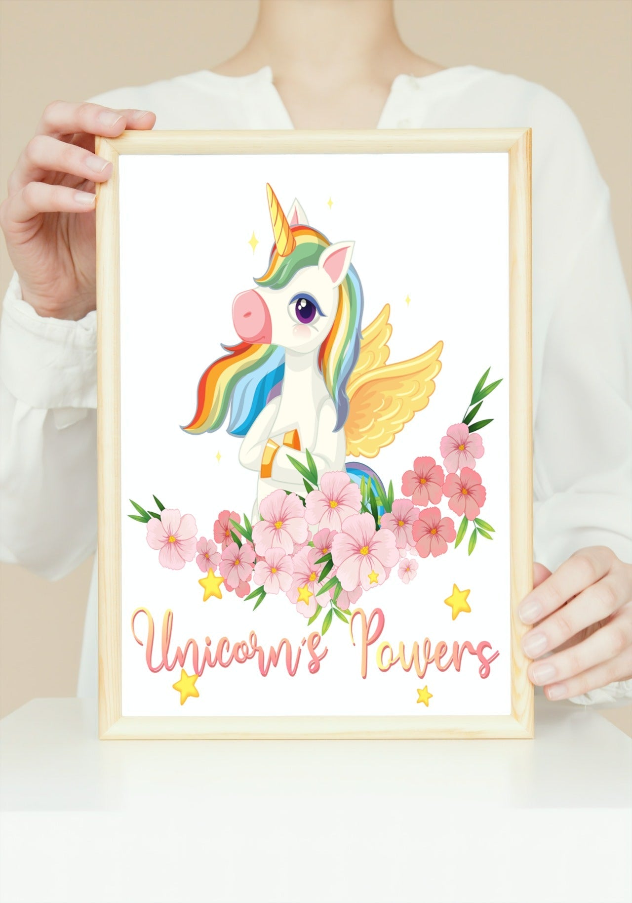 Plakat av enhjørning og rosa blomster. Fin å pynte veggen på rommet til ungene med. Kombiner gjerne med flere plakater og lag en bildevegg.