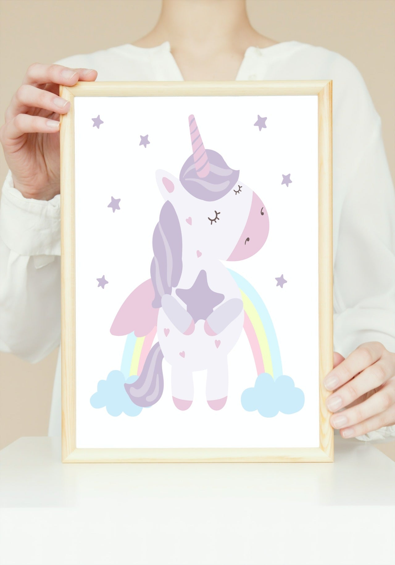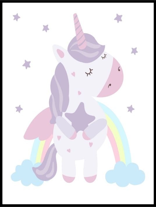 Plakat av enhjørning med stjerner i bakgrunnen. Fin å pynte veggen på rommet til ungene med. Kombiner gjerne med flere plakater og lag en bildevegg.