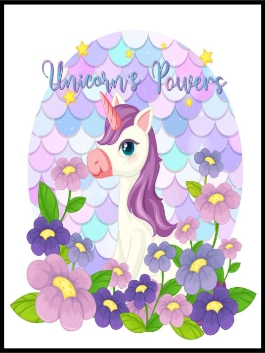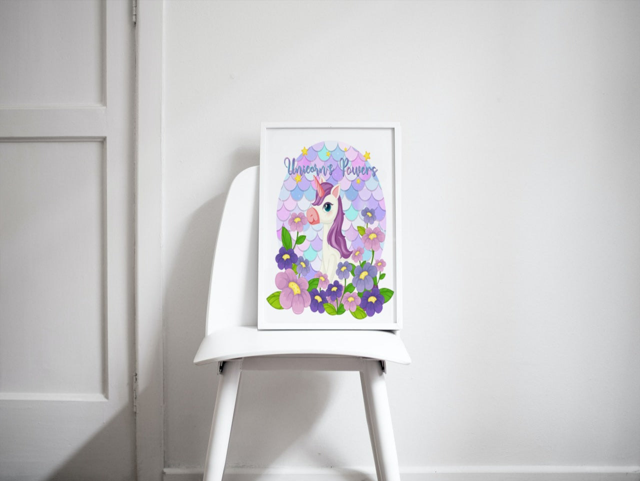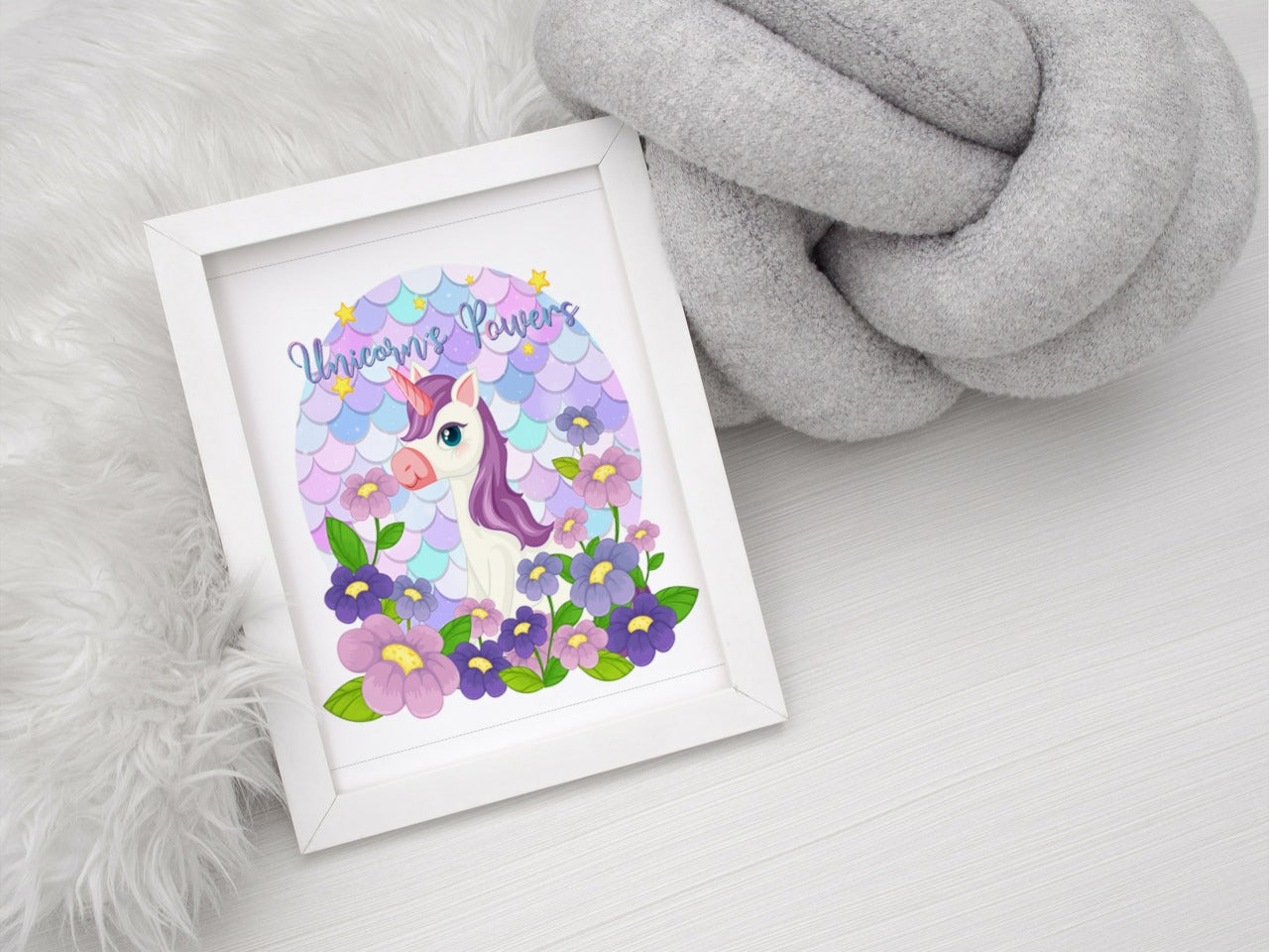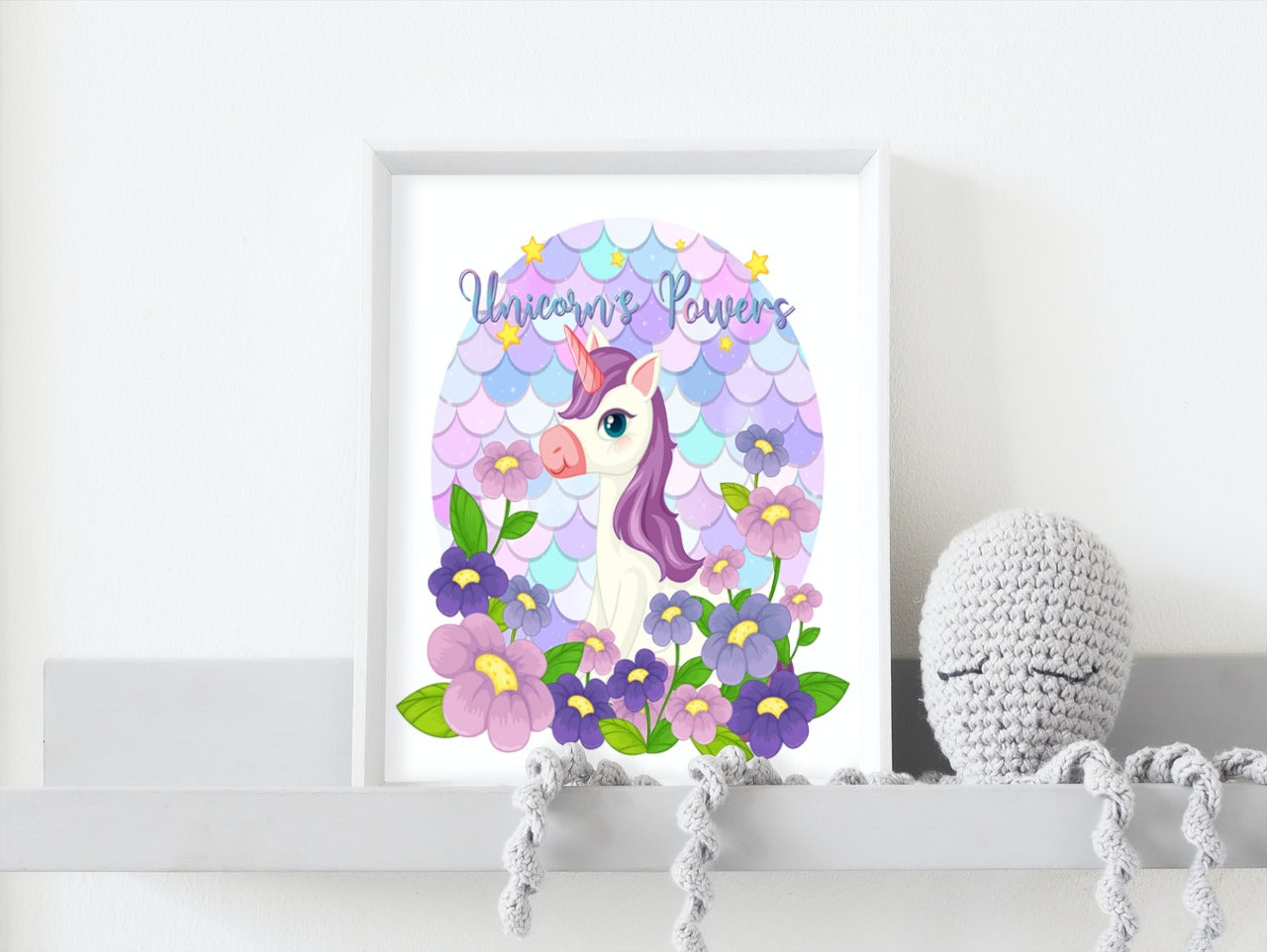 Plakat av enhjørning i lilla blomstereng. Fin å pynte veggen på rommet til ungene med. Kombiner gjerne med flere plakater og lag en bildevegg.