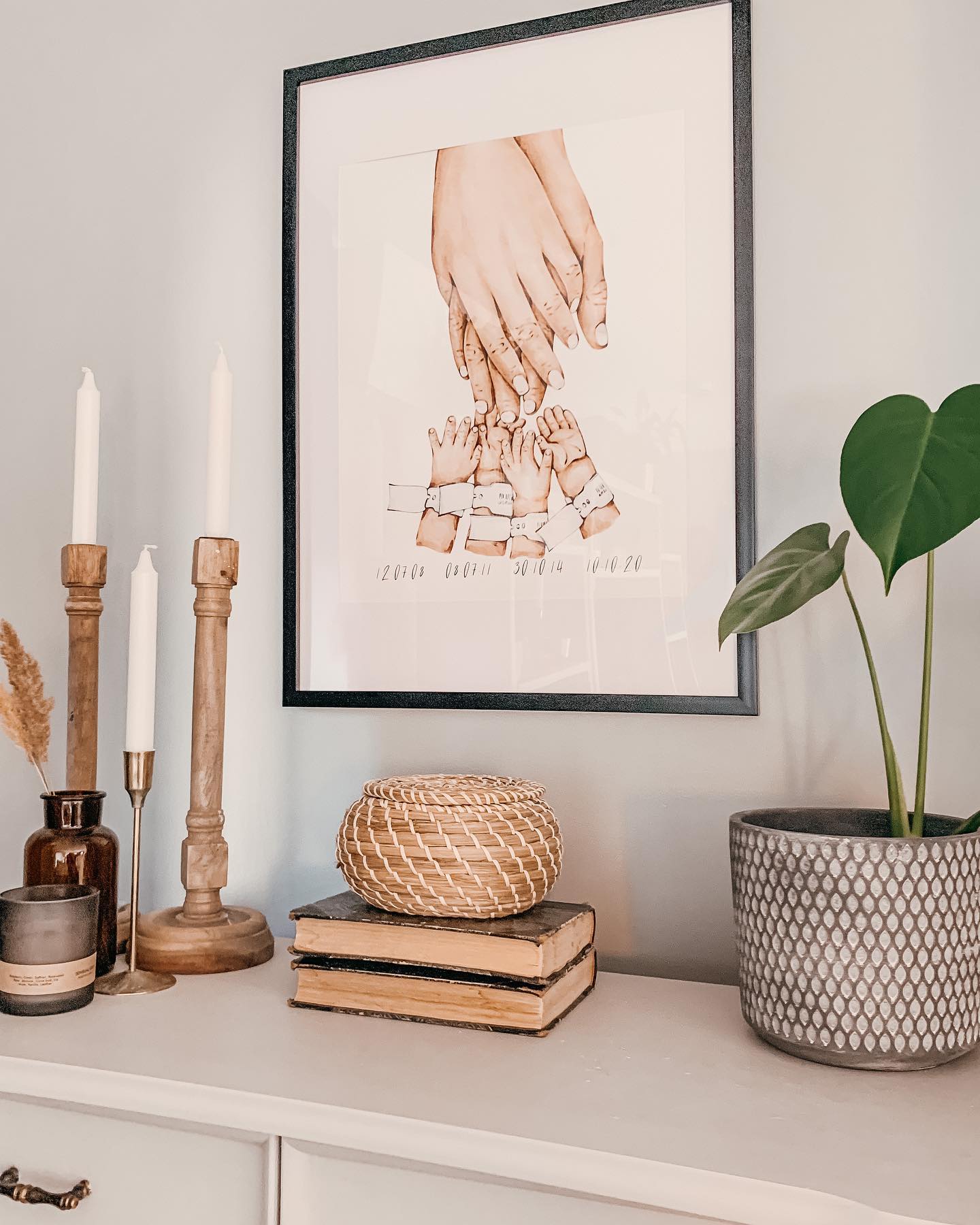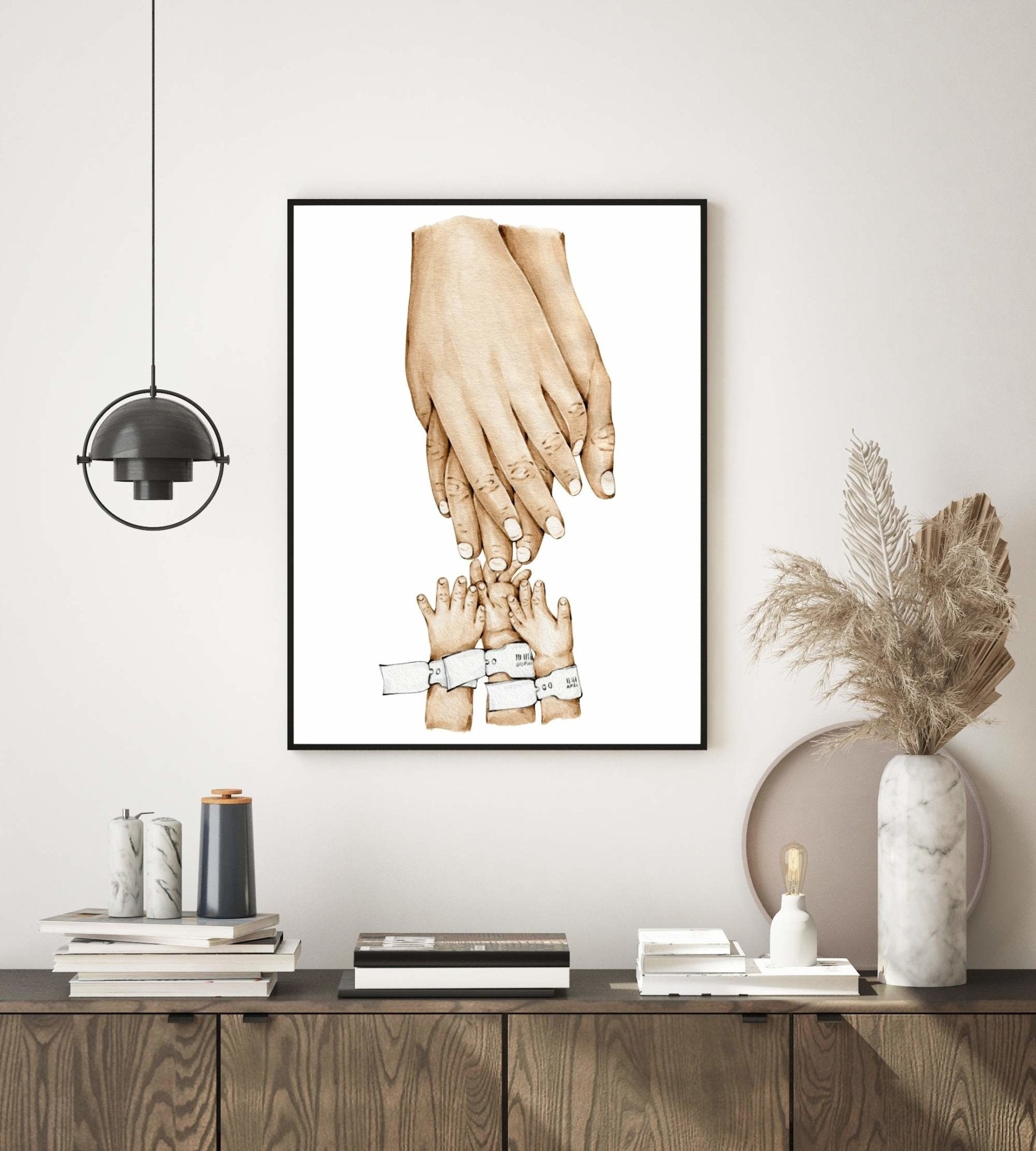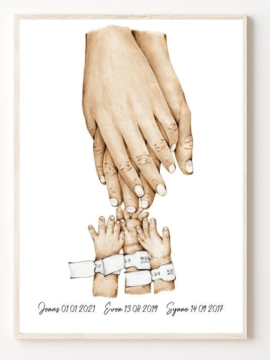 En skikkelig søt familieplakat. Illustrasjonene av hendene er håndmalt, og her kan du velge mellom 1-8 barnehender som holder i foreldrene hender.