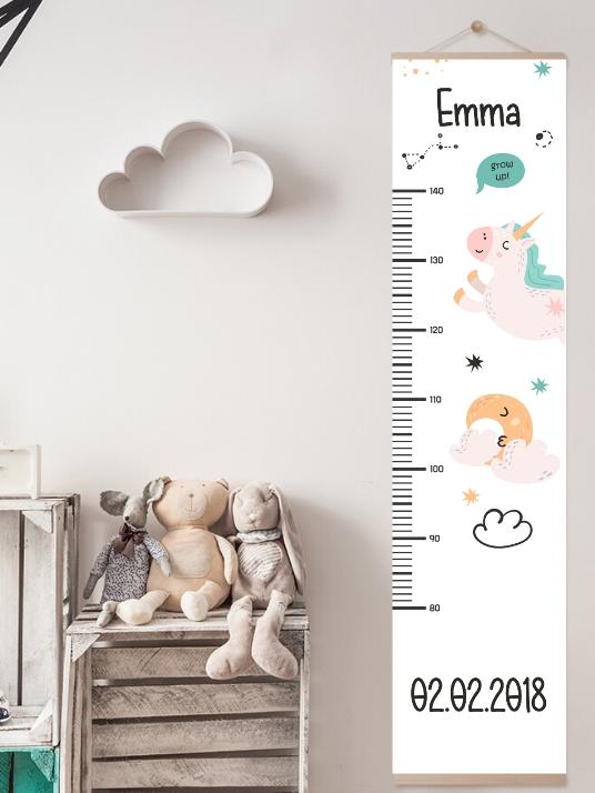 Søt høydemåler til barn med enhjørning, sol og måne og sky.