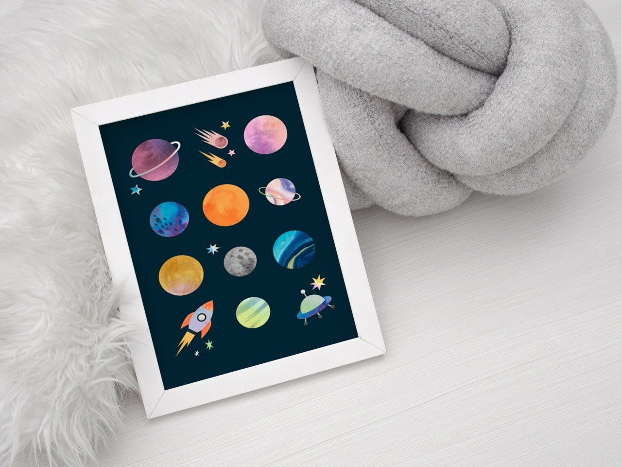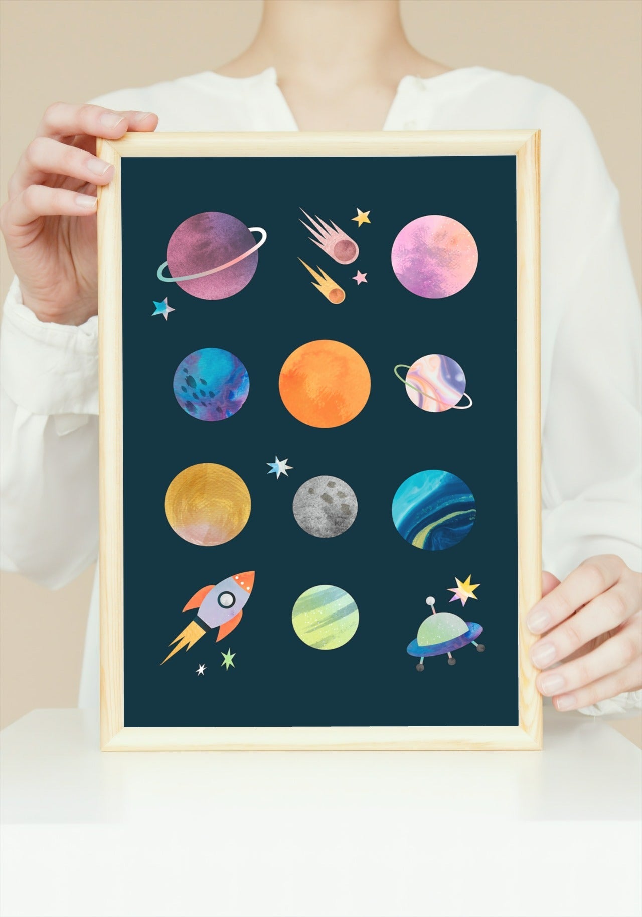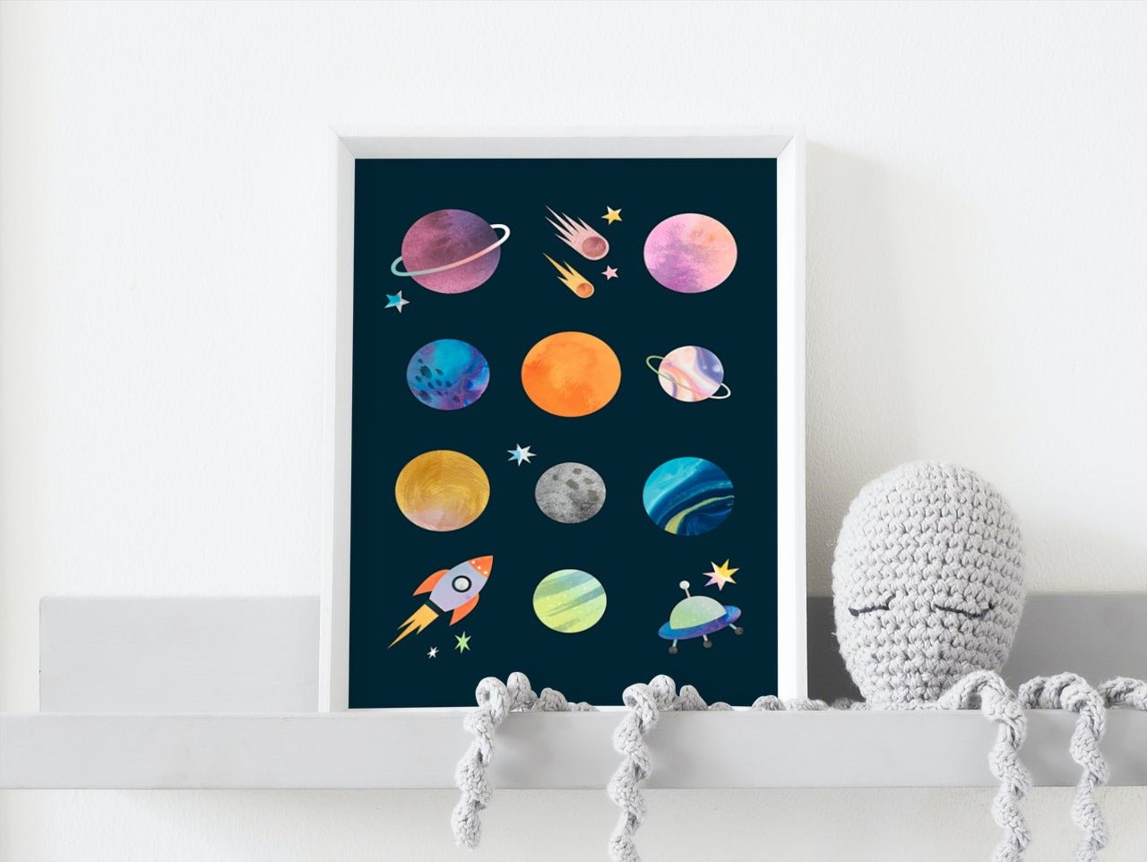 Fin plakat av planeter og rakett. Kombiner gjerne sammen med våre andre verdensromplakater for å lage en stilig bildevegg på barnerommet.