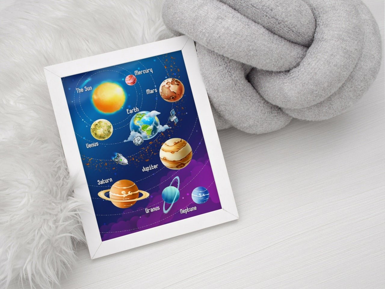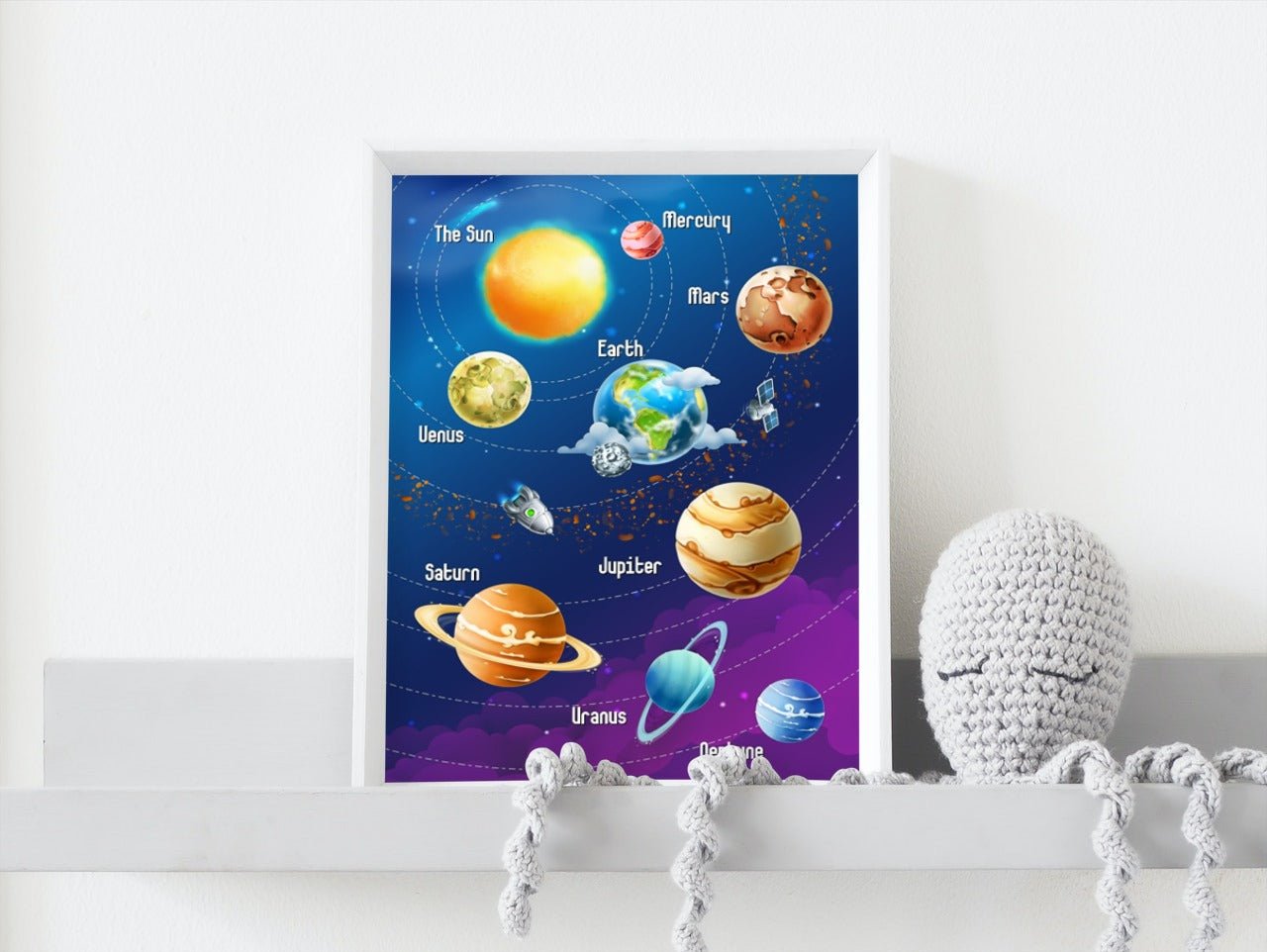 Fin plakat av planetene med navn. Kombiner gjerne sammen med våre andre verdensromplakater for å lage en stilig bildevegg på barnerommet.