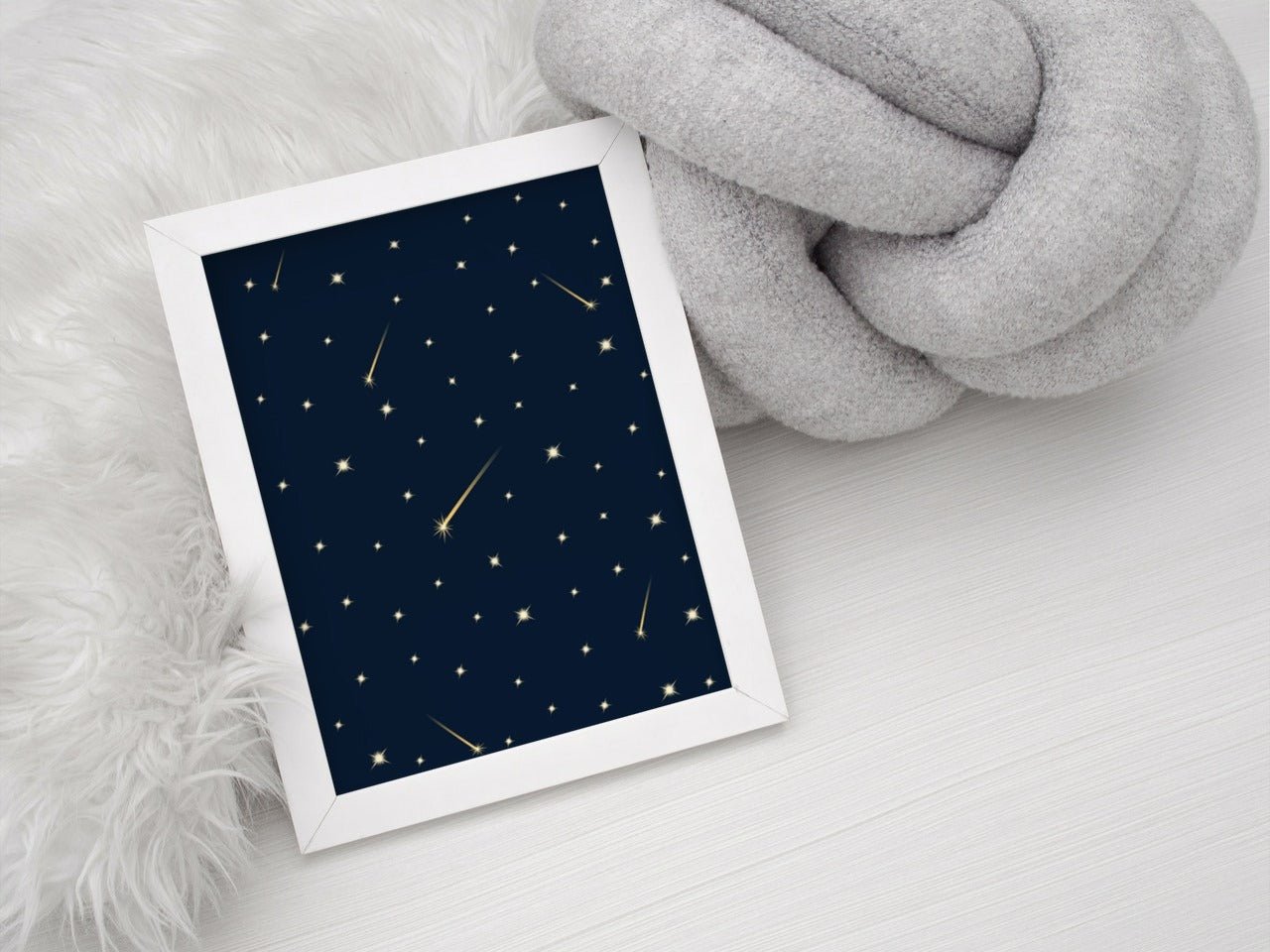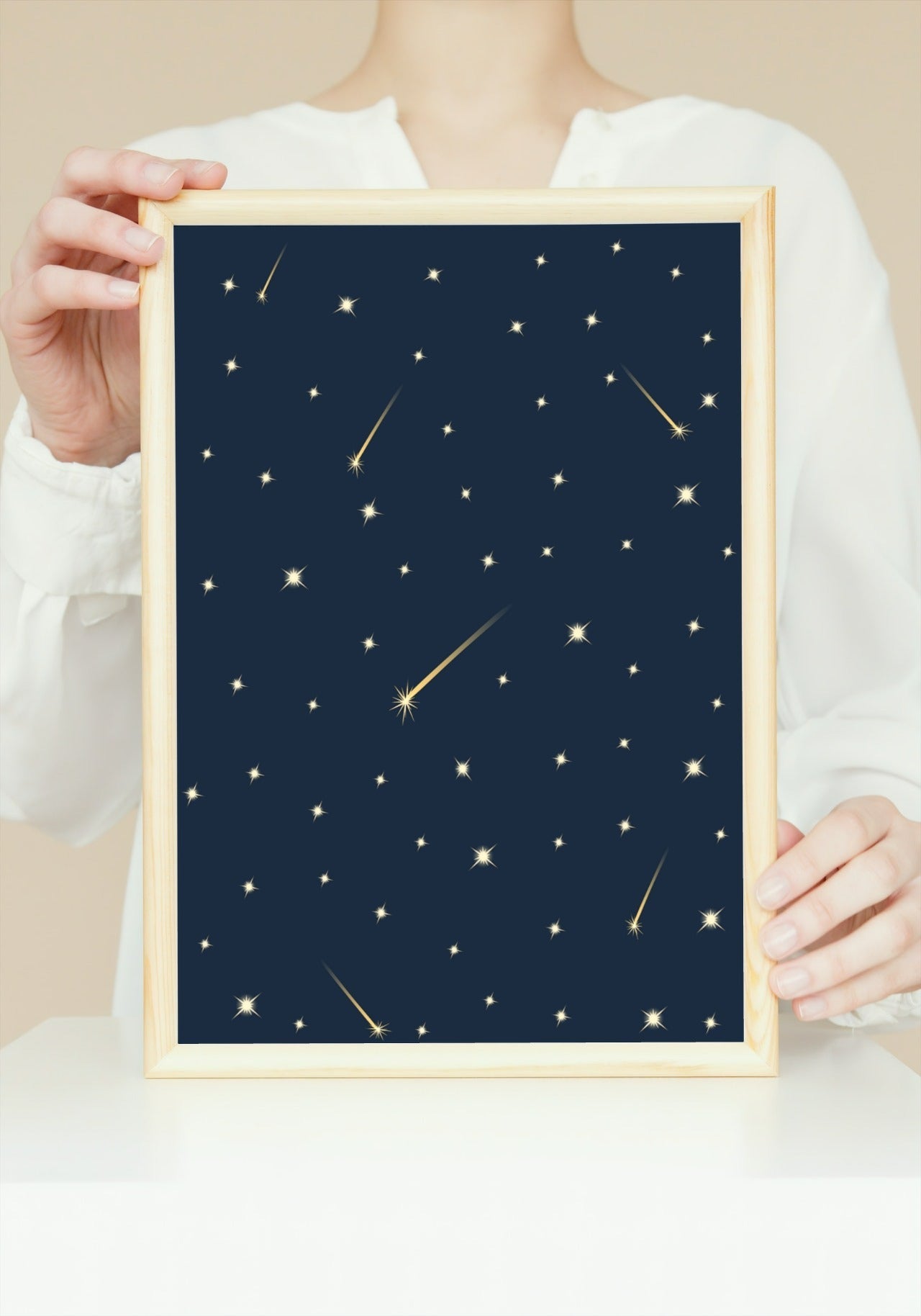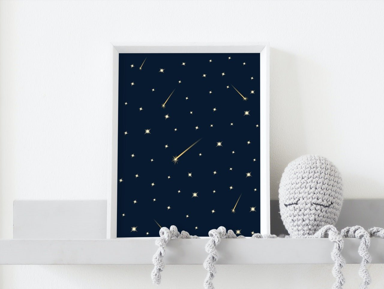 Fin plakat til barnerommet av stjerneskudd på stjernehimmelen. Kombiner gjerne sammen med våre andre verdensromplakater for å lage en stilig bildevegg på barnerommet.