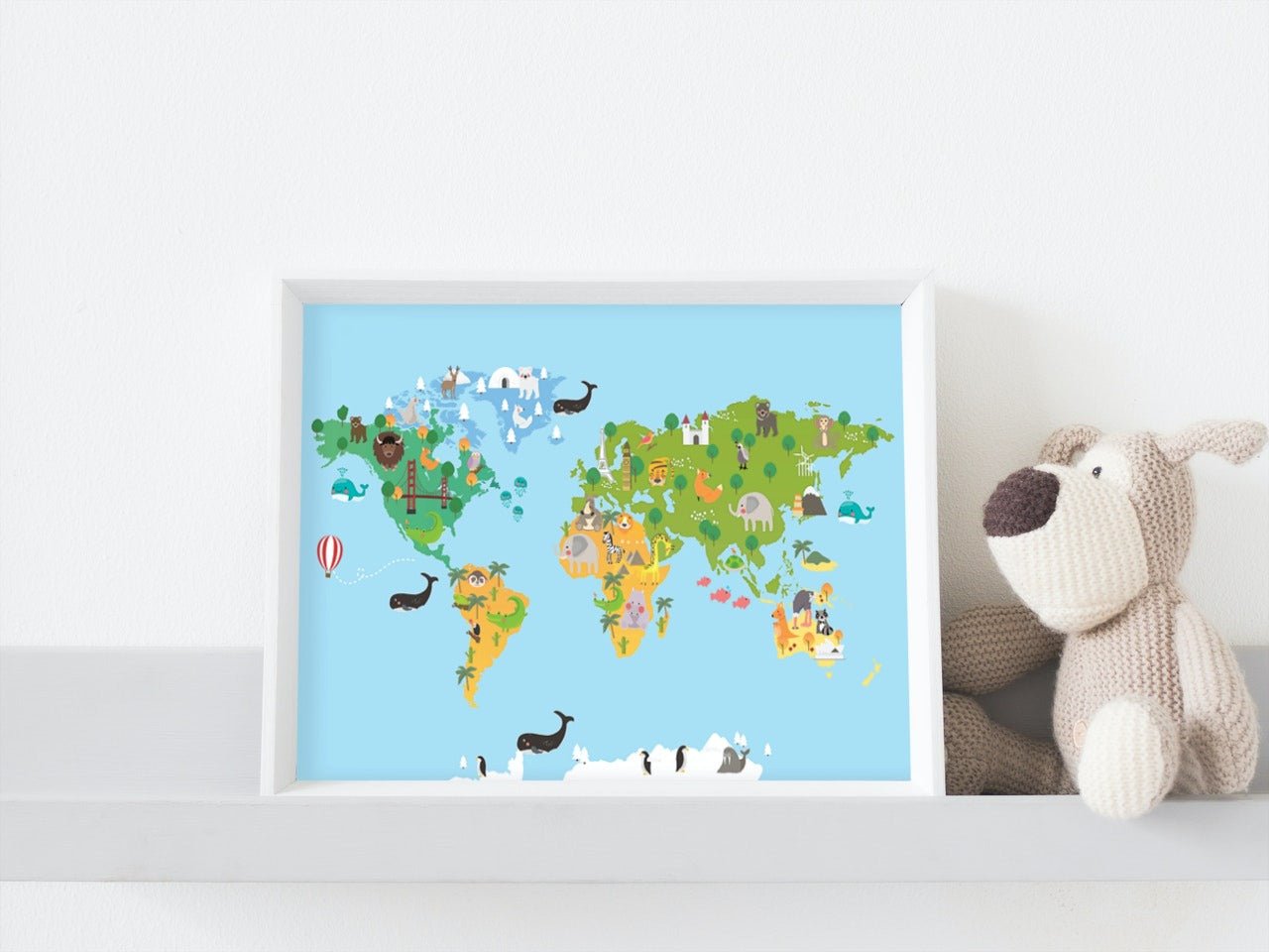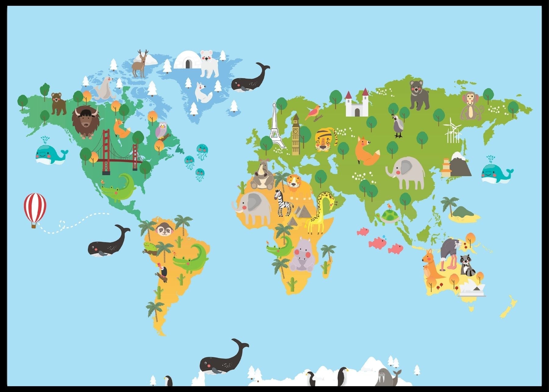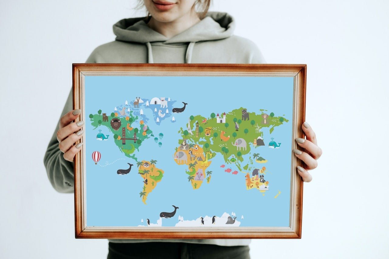 Stilig verdenskart til barn. Her kan de lære om hvordan verden ser ut med søte illustrasjoner og tegninger av dyrene som lever i de forskjellige verdensdelene.