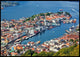Bryggen i Bergen med seilbåter ankret opp, i langstrakt panorama format.