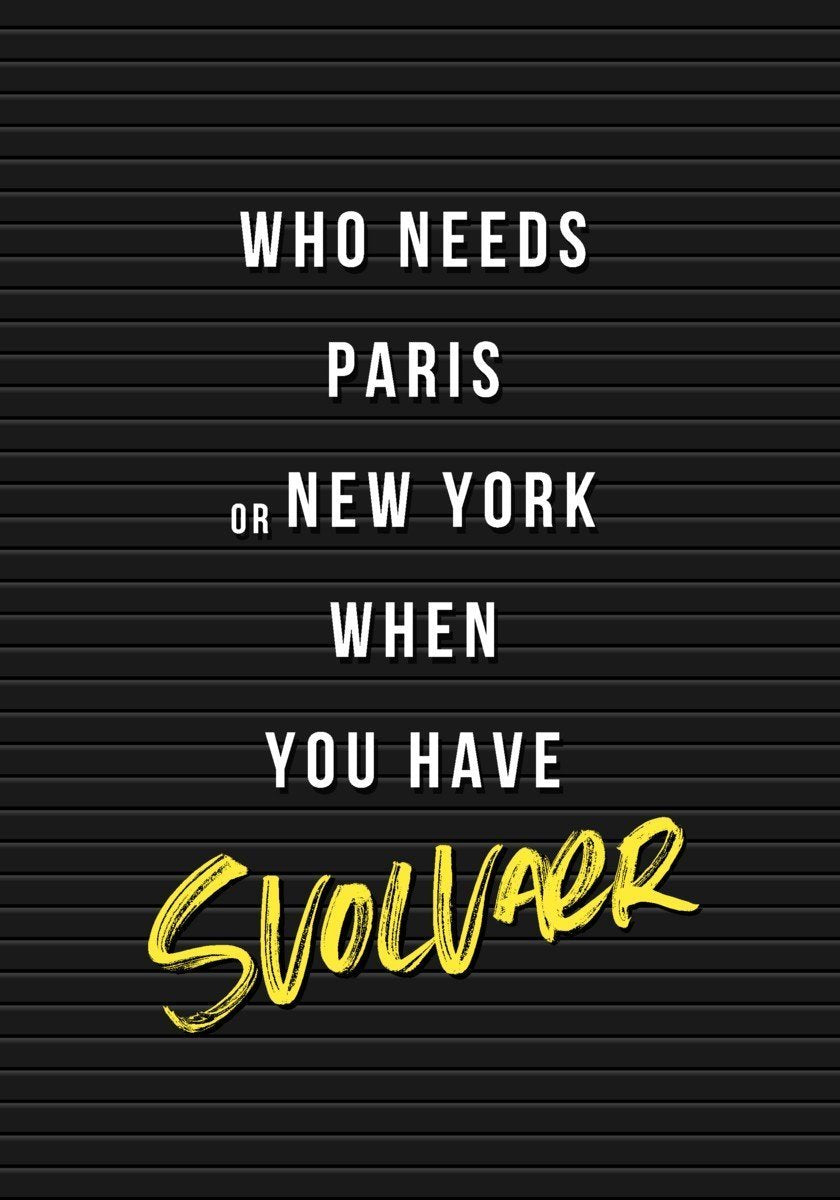 Stilren og artig byposter med teksten "who needs paris or new york when you have SVOLVÆR".