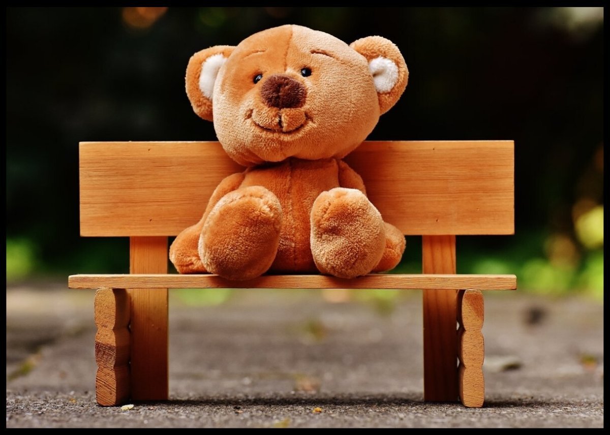 Koselig poster av en teddybjørn som sitter på en benk. Dette bildet vil ta seg godt ut på barnerom og passer i alle størrelser både som plakat og lerret.
