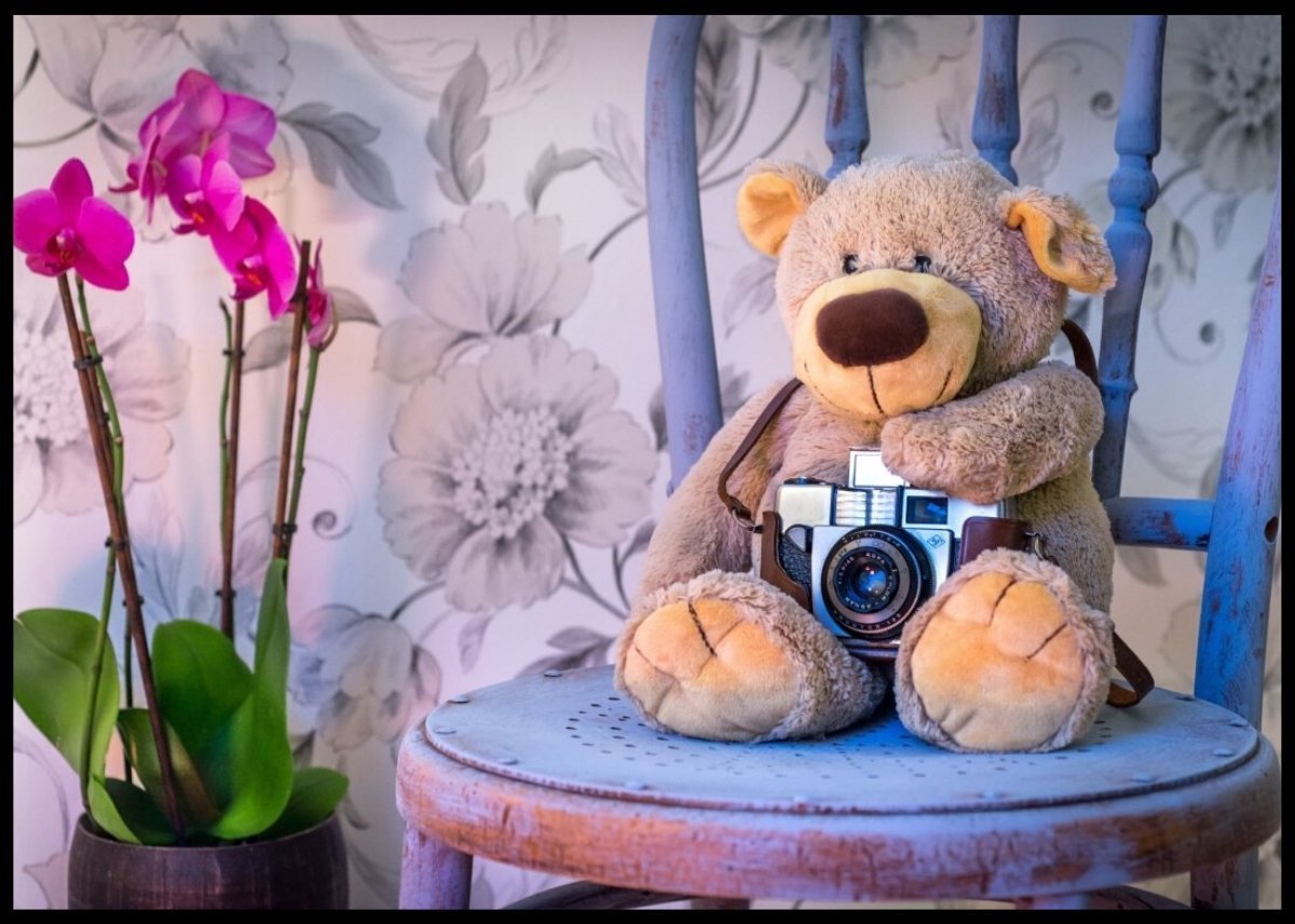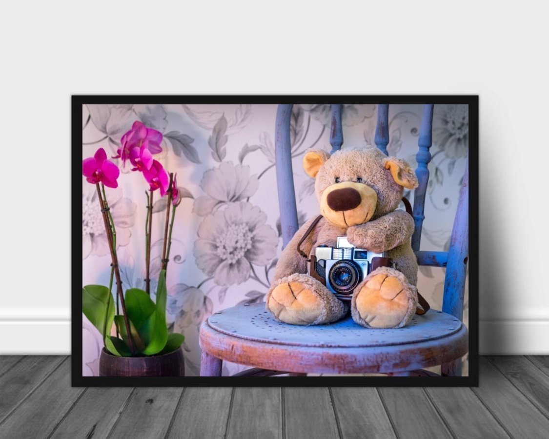 Ett søtt bilde av en teddybjørn som sitter på en stol. Passer veldig godt som både plakat og lerret.