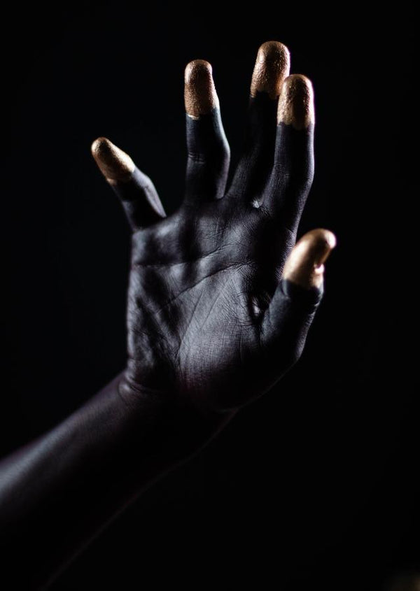 En stilig hånd med gullfargede fingerspisser. På det ene bildet kan du se hvordan vi har satt sammen gullhånd 1, gullhånd 2 og gullhånd 3 til en stilig fotovegg.
