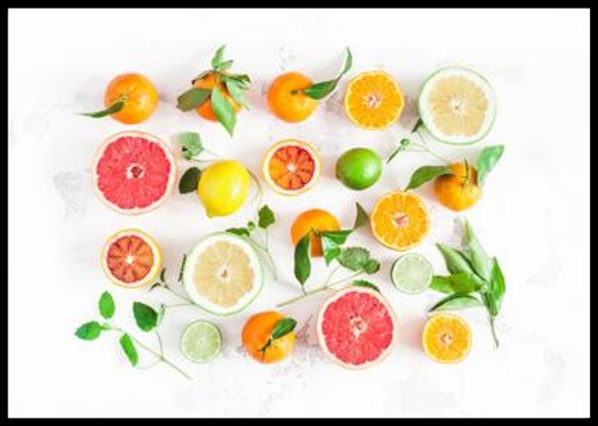 Fargerikt bilde av frukt på hvitt bord. Passer godt på kjøkkenet!