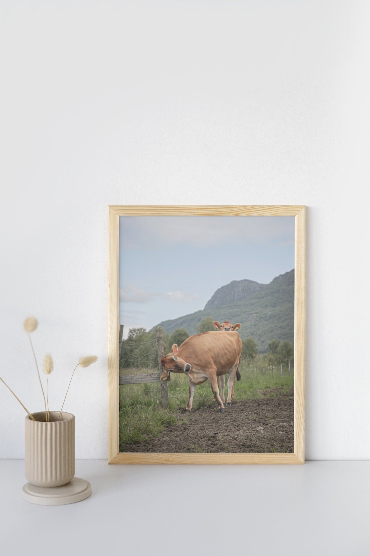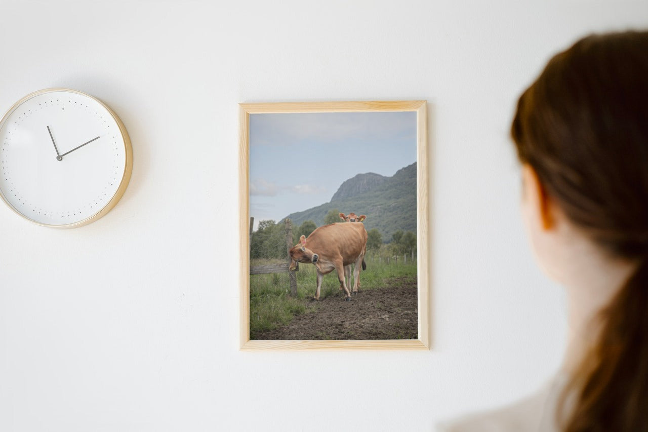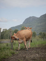 "Jersey kviger". Jersey kviger som klør seg på gjerdepålen.