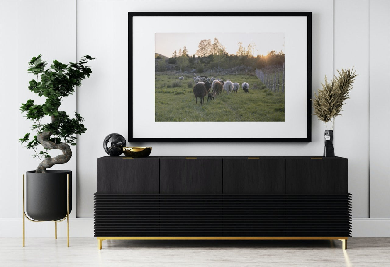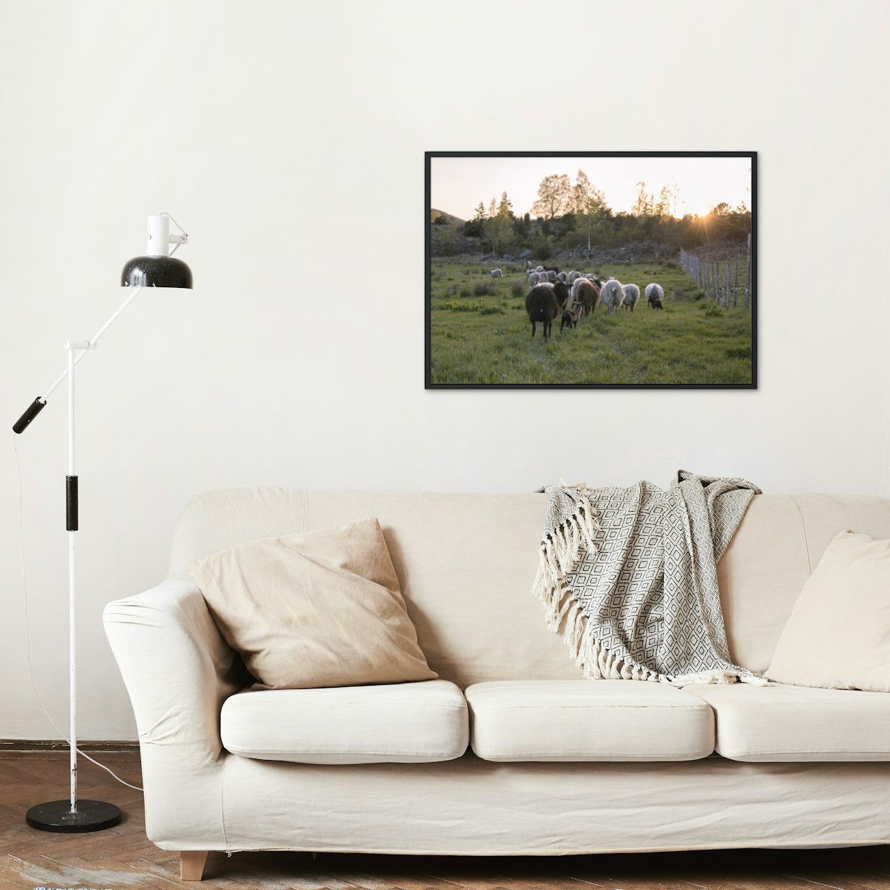 "Villsauflokk med lam -En villsauflokk med lam som går å nyter livet på beitet, mens vårsolen går ned.