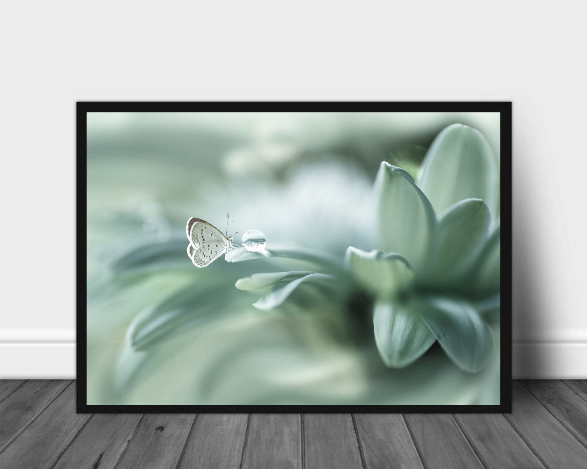 Plakat av et fantastisk motiv, med sommerfugl foran en vanndråpe på en grønn plante.