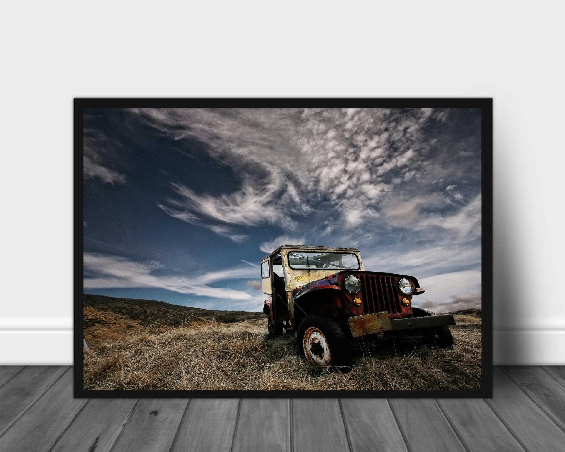 Plakat av en gammel og rusten bil i terrenget og mot en flott sky himmel.