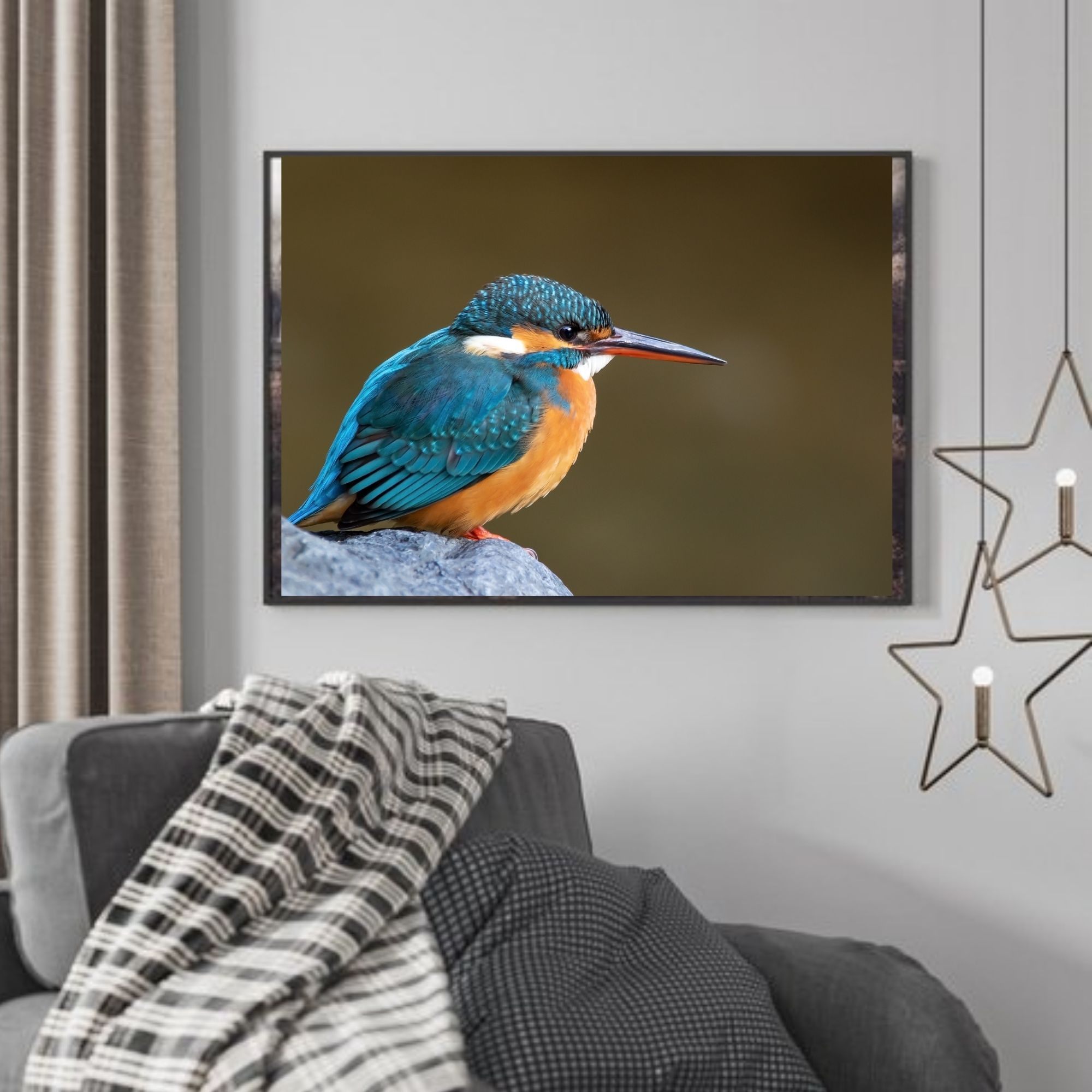 Plakat av en flott isfugl som sitter på steinen og speider etter fisk.