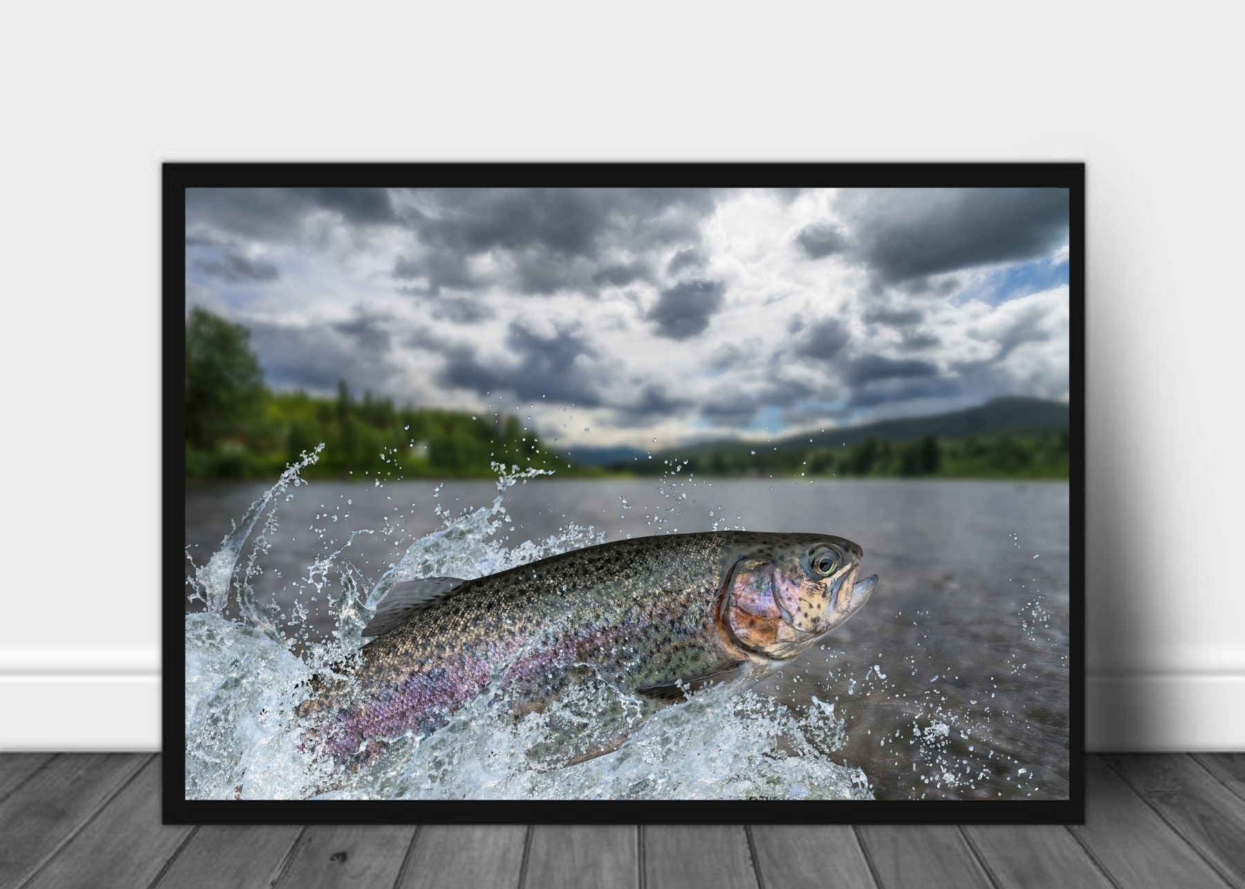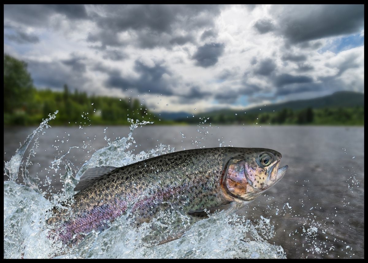Fantastisk plakat av en flott regnbue ørret som hopper etter insekter