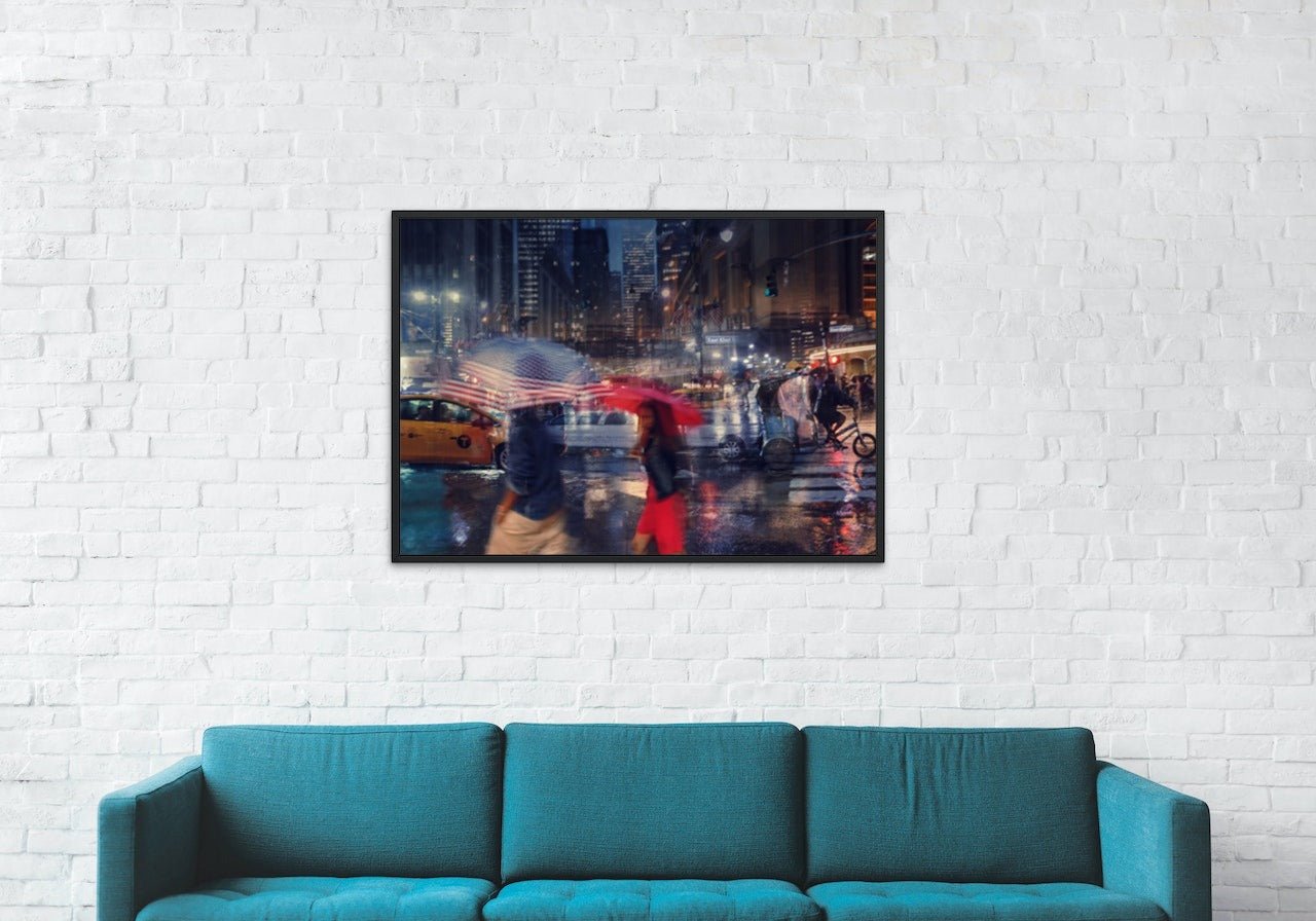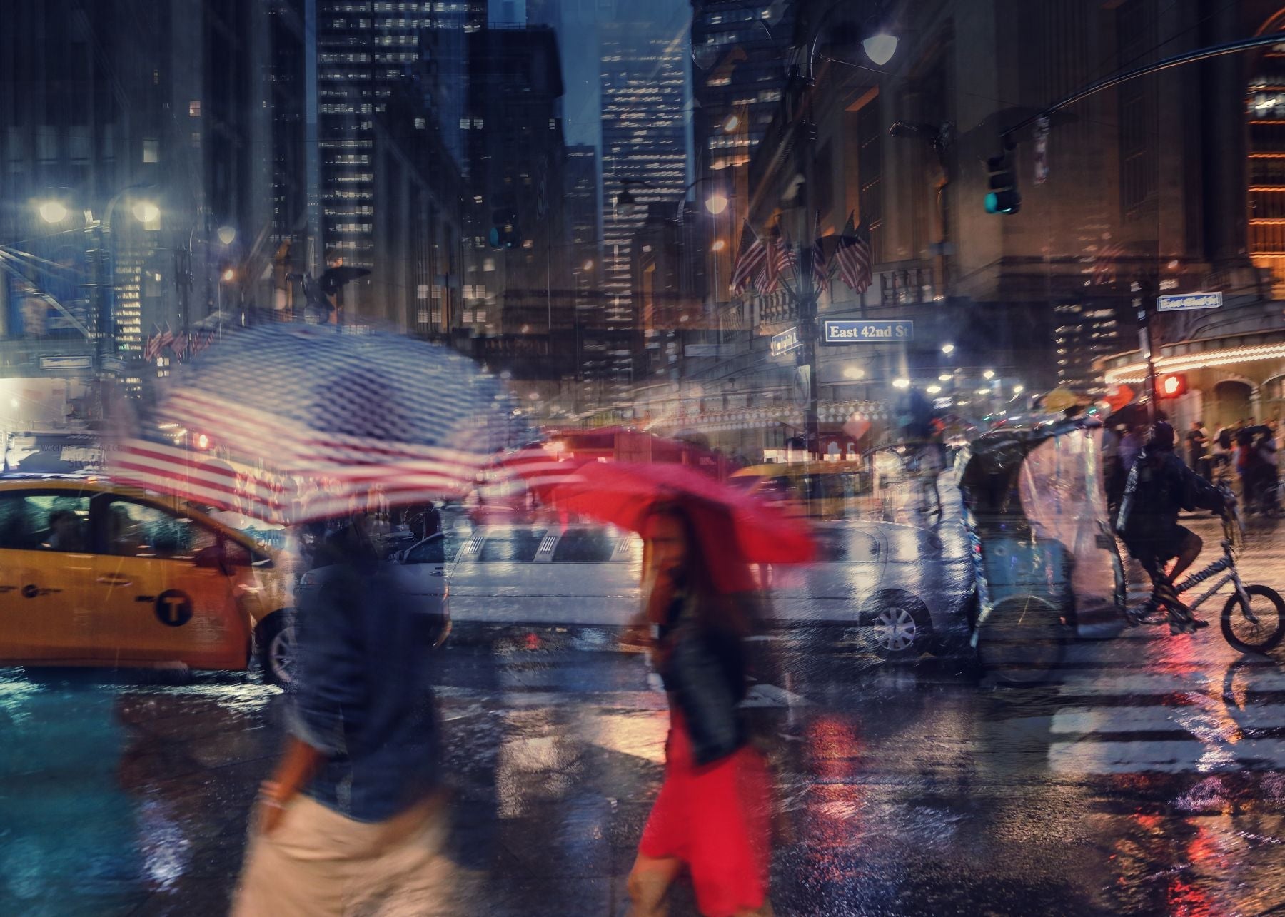 Plakat av et typisk bybilde fra New York., med masse farger, elementer og bevegelse.