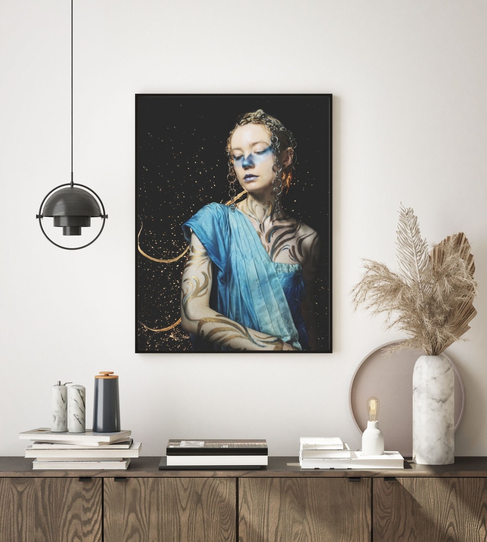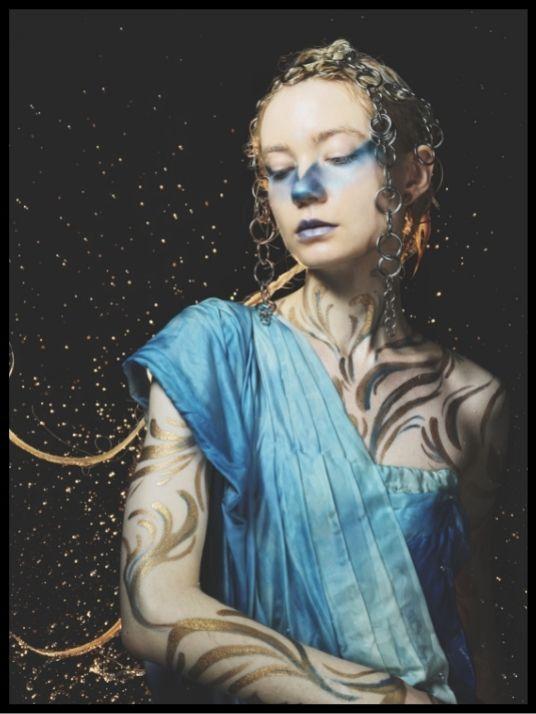 Plakat av dame med kroppsmaling i blått og gull.