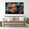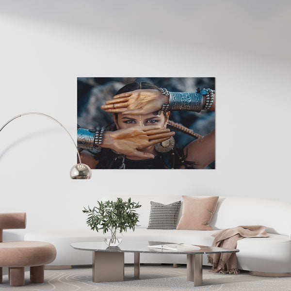 • Etter printing spennes lerretsduken på en kraftig blindramme. For de fleste formatene bruker vi en 40mm tykk ramme, slik at det oppnås en flott dybde-effekt når rammen henges på veggen. Deretter monterer vi på oppheng med stålvaier og kunstverket ditt kan henges rett på vegg.
