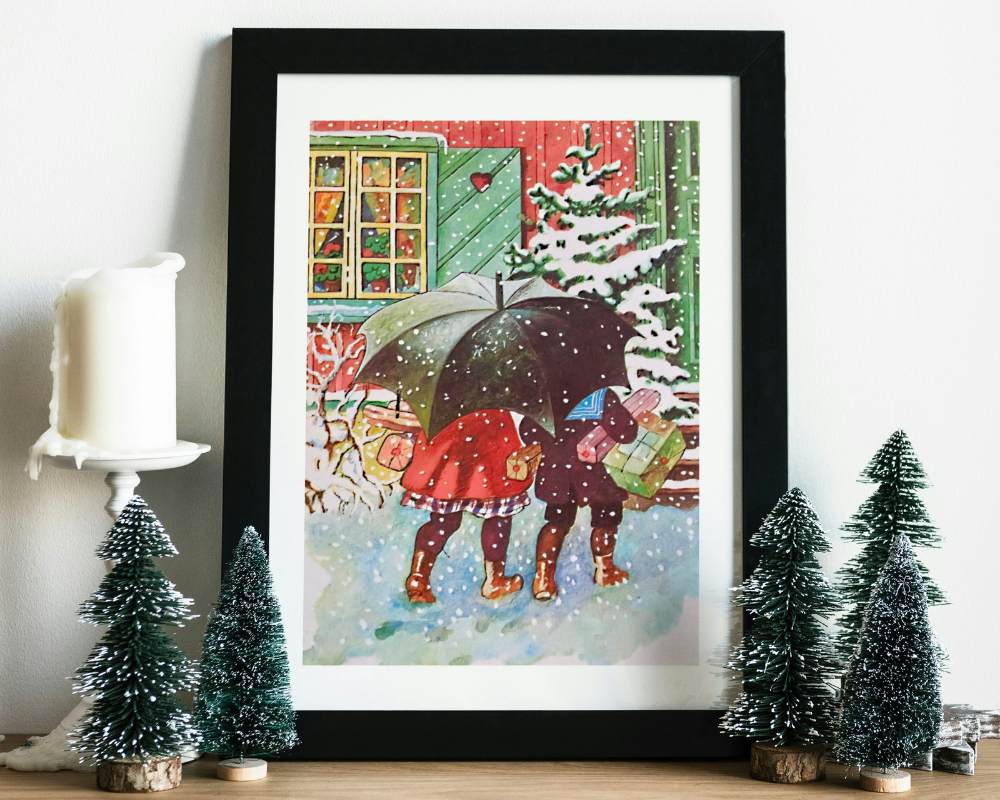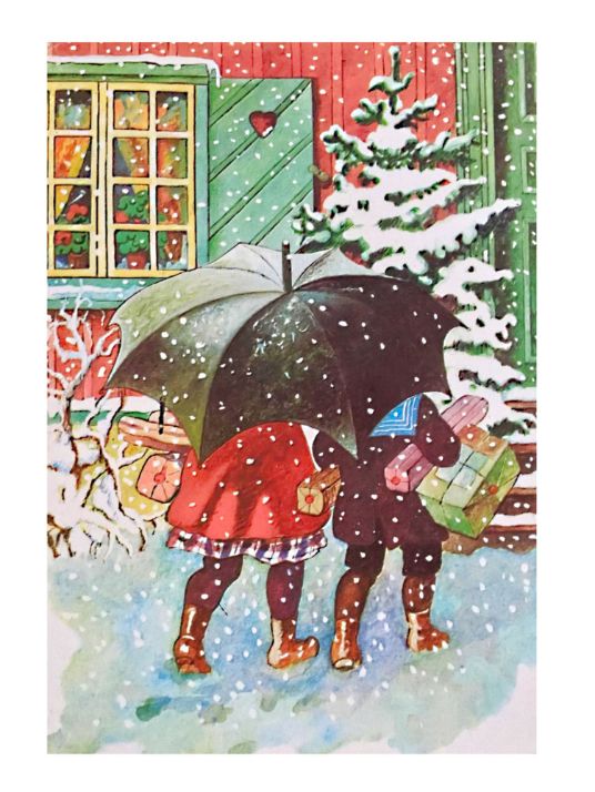 En klassiker av et julemotiv som er laget av den svenske kunstneren Jenny Nystrøm. Hun er av mange regnet som "moren av julekort" i Norden og du kjenner nok igjen motivene hennes.