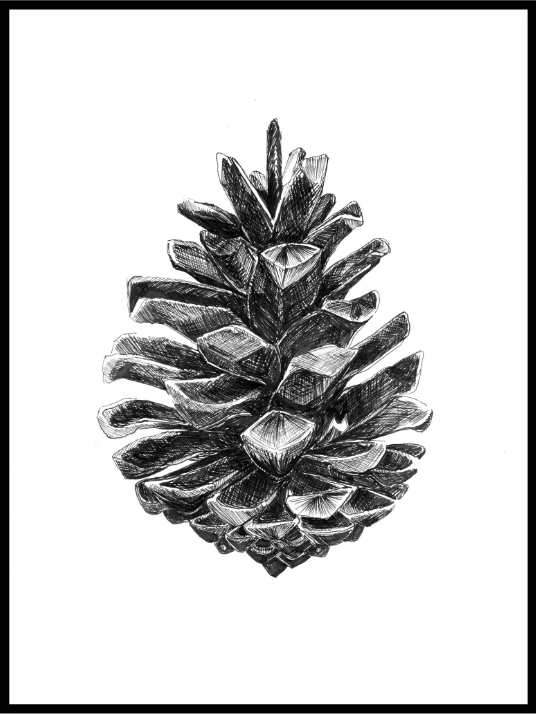 Nydelig håndtegnet furukongle som passer setter prikken over i`en på en bildevegg med vintermotiver. Motivet er laget av den lokale kunstneren Jessica Hugøy og er spesiallaget for Plakatbar.