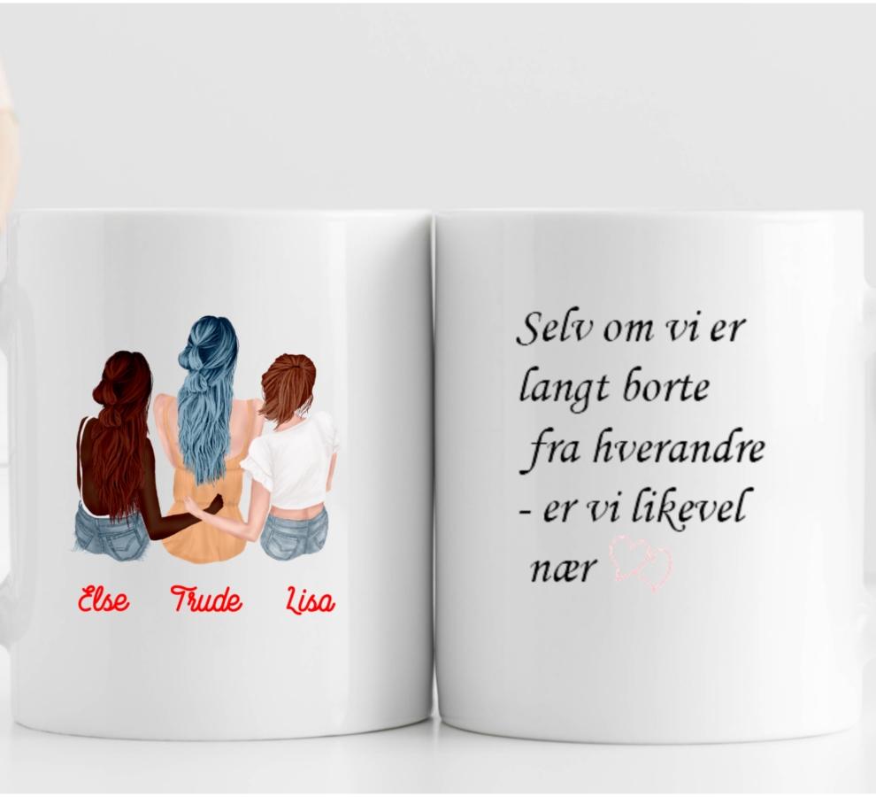 Ønsker du en personlig gave til bestevenninnene dine som betyr noe? Da har du funnet riktig gave! På bestevenninnekruset vårt kan du velge alt fra hudfarge / frisyre og klær på de tre venninnene. Du velger selvfølgelig hvilke navn som skal være på kruset, og du kan også velge mellom 3 fine sitater som kommer på baksiden av kruset.