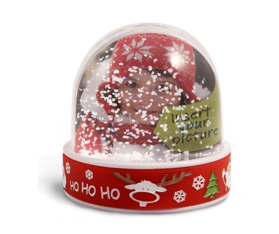 Vannfylt fotoglobus (ristekule) med juledetaljer og julesnø. Sett inn ditt eget bilde 7x6cm
