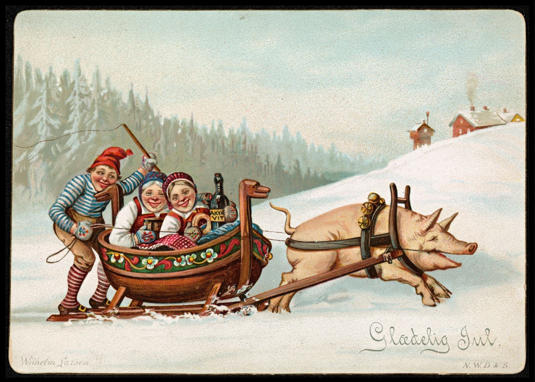 Poster av serien "Humoristiske julekort" av Wilhelm Larsen. Han ble født i1854 og døde i 1893. Han leverte illustrasjoner til blader og tidsskrifter og gjerne med et humoristisk tilsnitt.