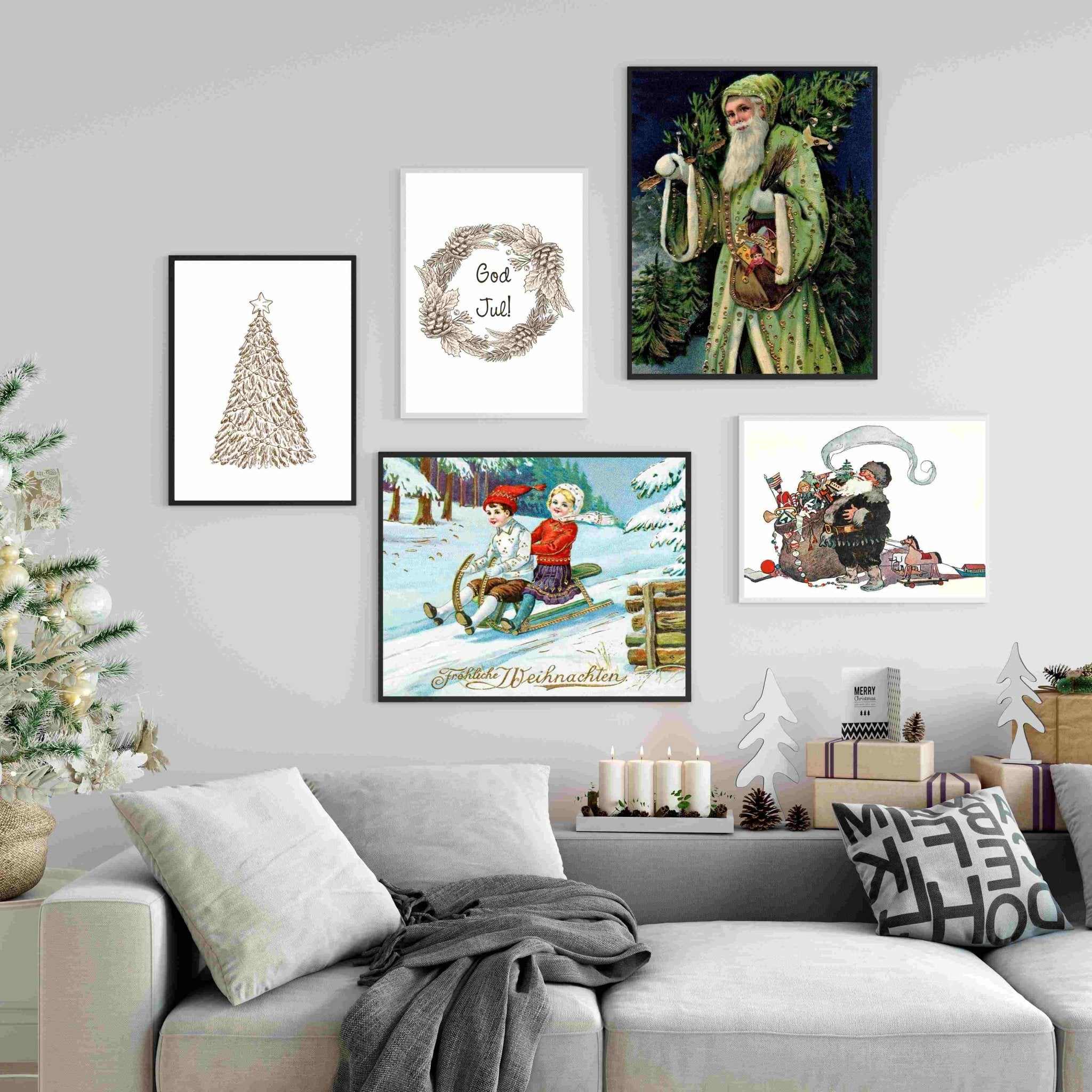 Retro juleposter med gammeldags julenisse som bærer et juletre. Passer veldig godt på en bildevegg til jul.