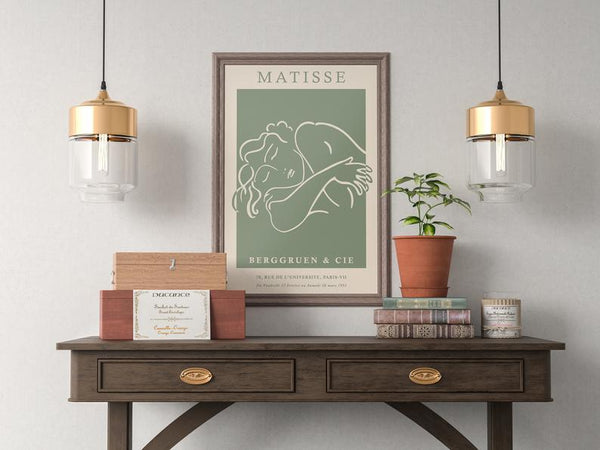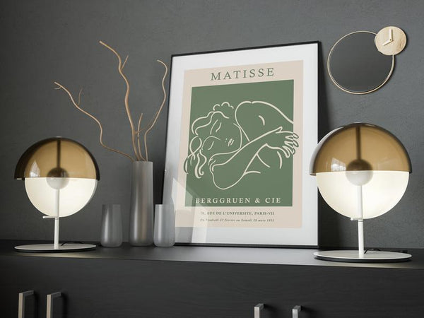 Kunstplakat med illustrasjon inspirert av den anerkjente Henri Matisse. Nydelig sammensetning. Lag en bildevegg av våre dekorative kunstplakater! Denne illustrasjonen tar utgangspunkt i aspekter fra maleriene til Matisse og er modernisert for å passe inn i skandinaviske hjem.