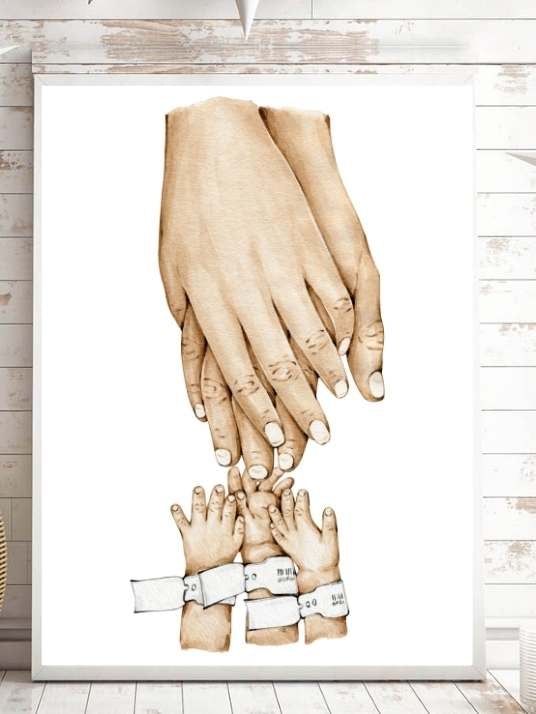 En skikkelig søt familieplakat. Illustrasjonene av hendene er håndmalt, og her kan du velge mellom 1-8 barnehender som holder i foreldrene hender.