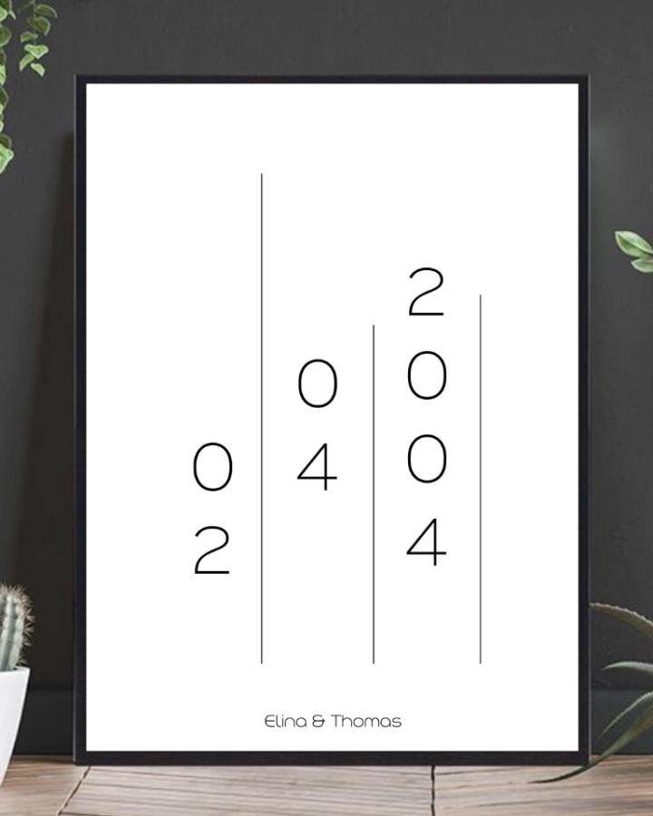 Datoplakat med stilrent design. Du velger selv navn og dato på plakaten. Skriv inn navnet til deg selv og din kjære og velg hvilke dato du vil ha på plakaten. Det kan for eksempel være dato for når dere ble sammen, bryllupsdato eller en annen dato som betyr noe spesielt for dere.