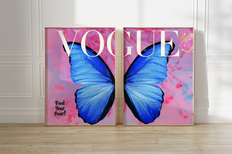 Bildesett av sommerfuglvinger fra Vogue. Nydelige fargetoner som er preget av blåfarge og rosa. Disse motivene selges som sett på 2 stk og kan enten kjøpes som plakat eller lerret.