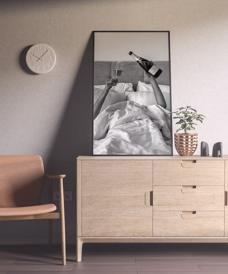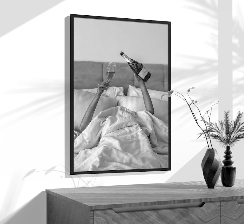 Stilig sort/hvitt plakat av kvinne som drikker i sengen.