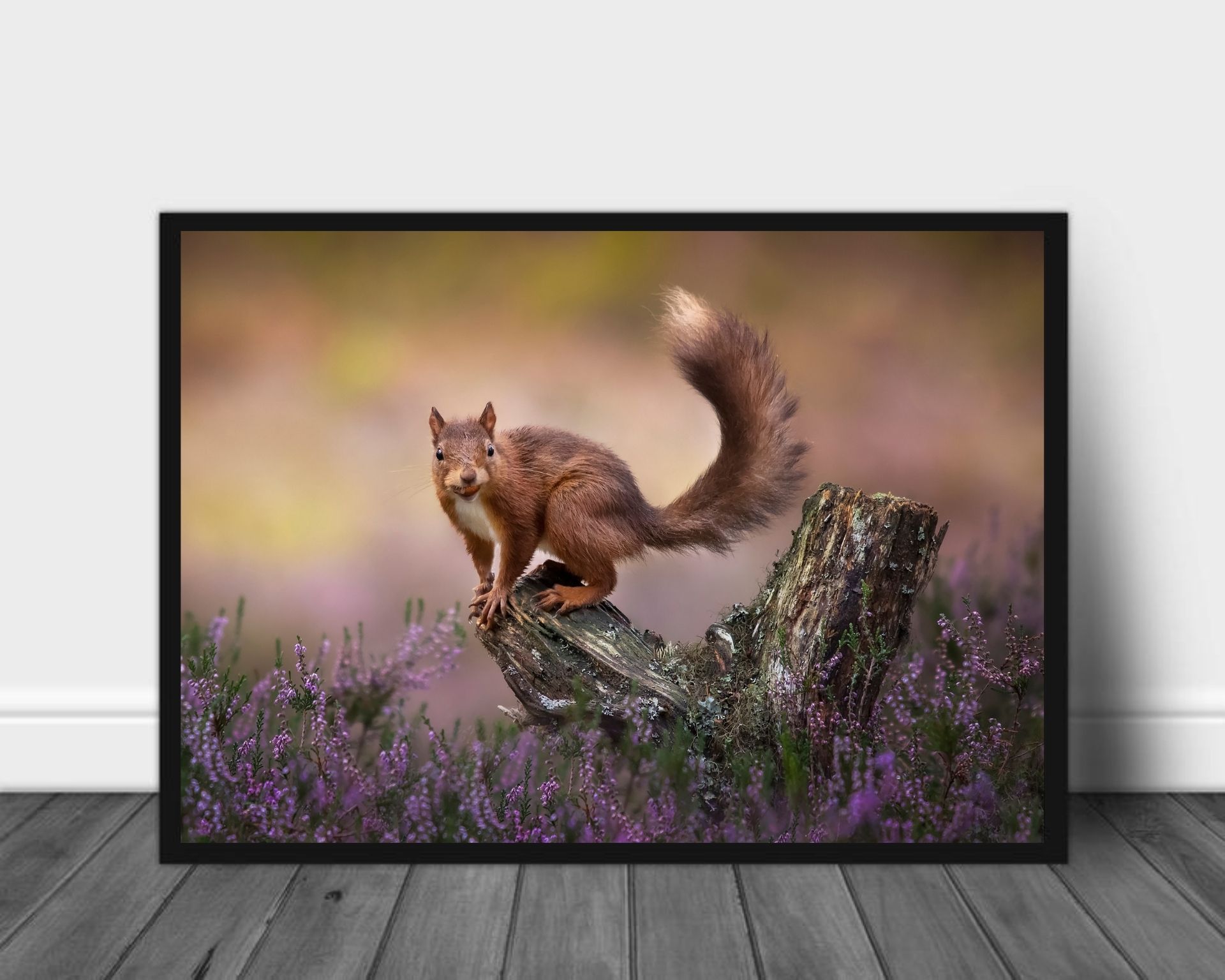 Plakat av et ekorn på en stubbe midt i høstlyngen