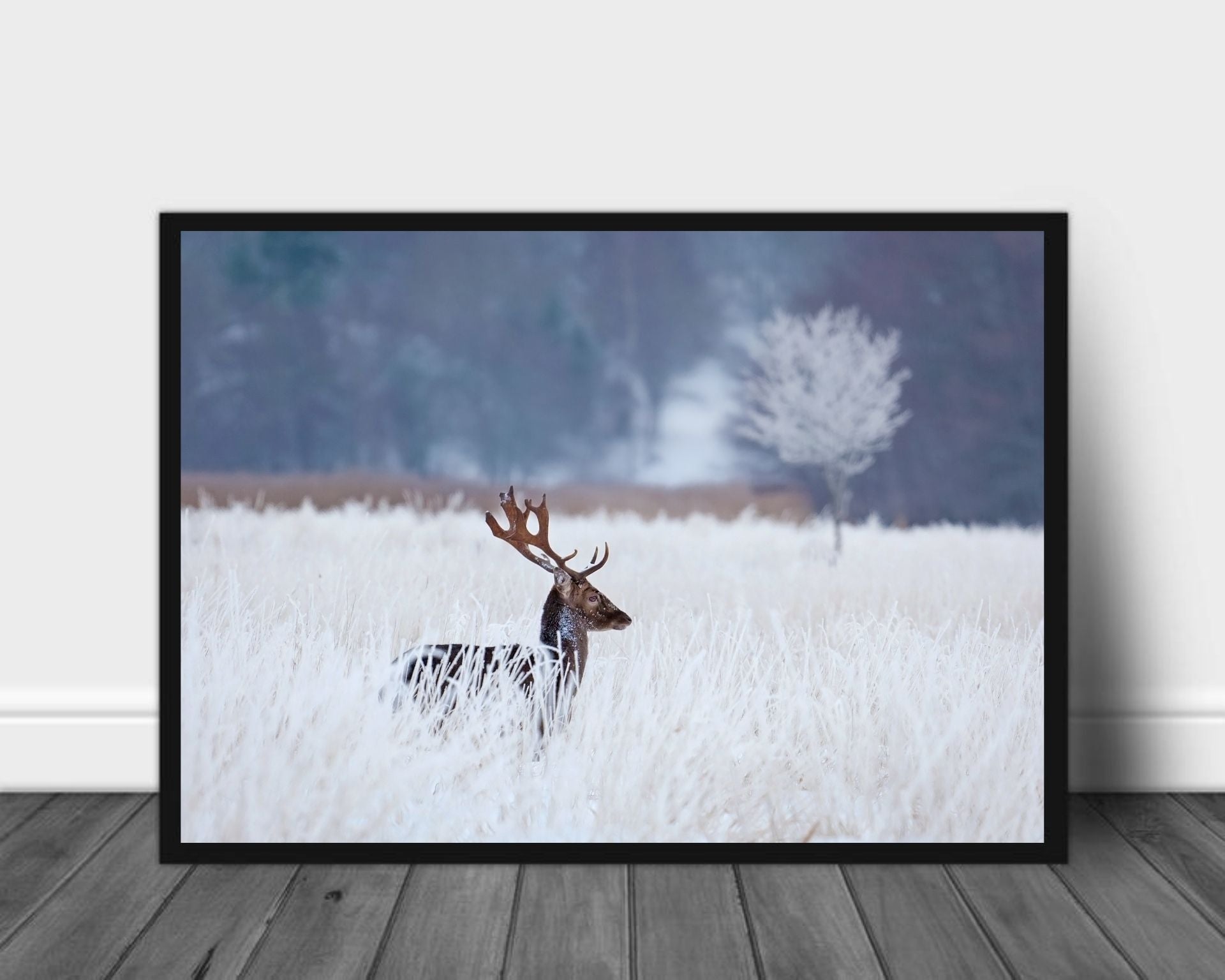 Plakat av en hjort ute på den isfrosne marken