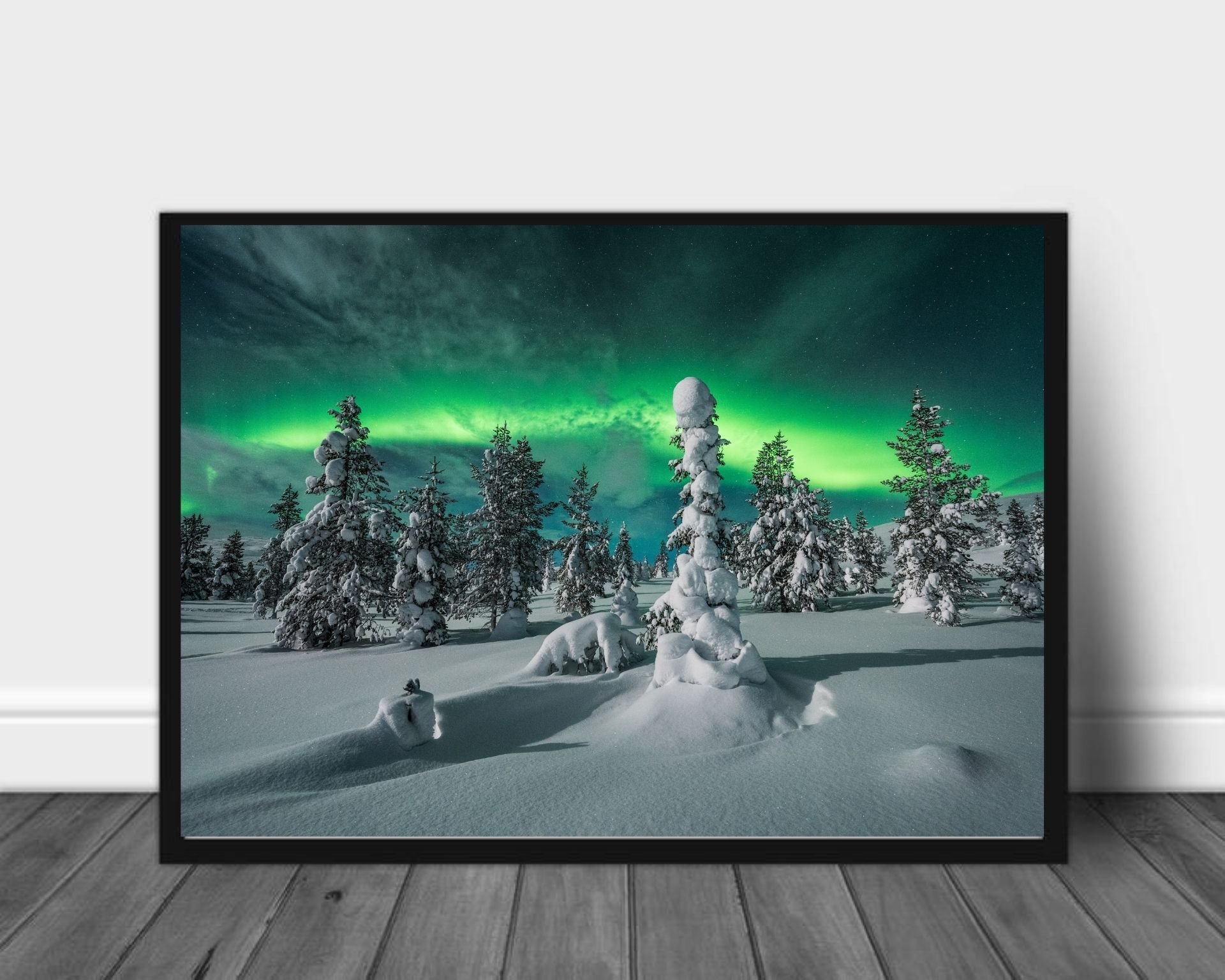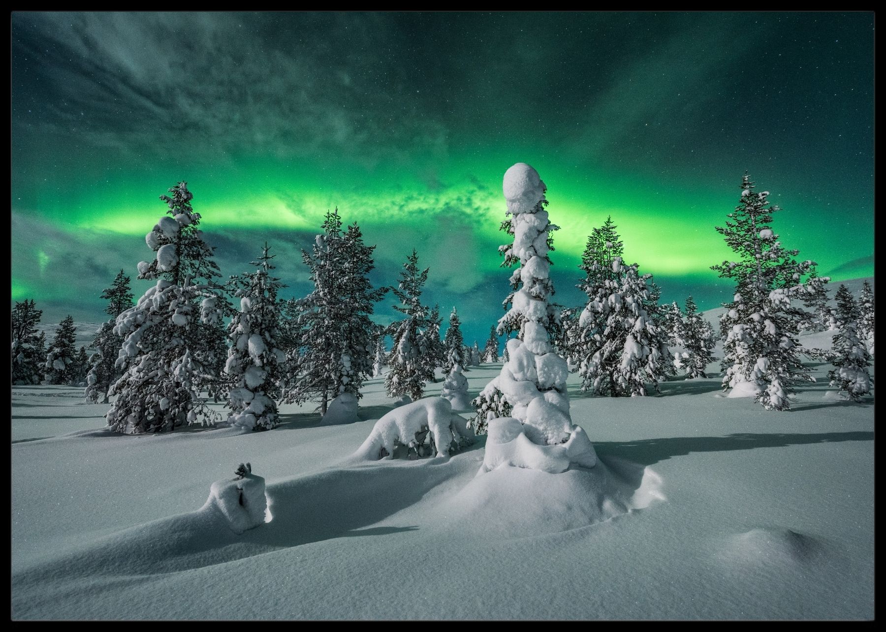 Plakat av et praktfullt nordlys over vinterskogen med snøtunge greiner.