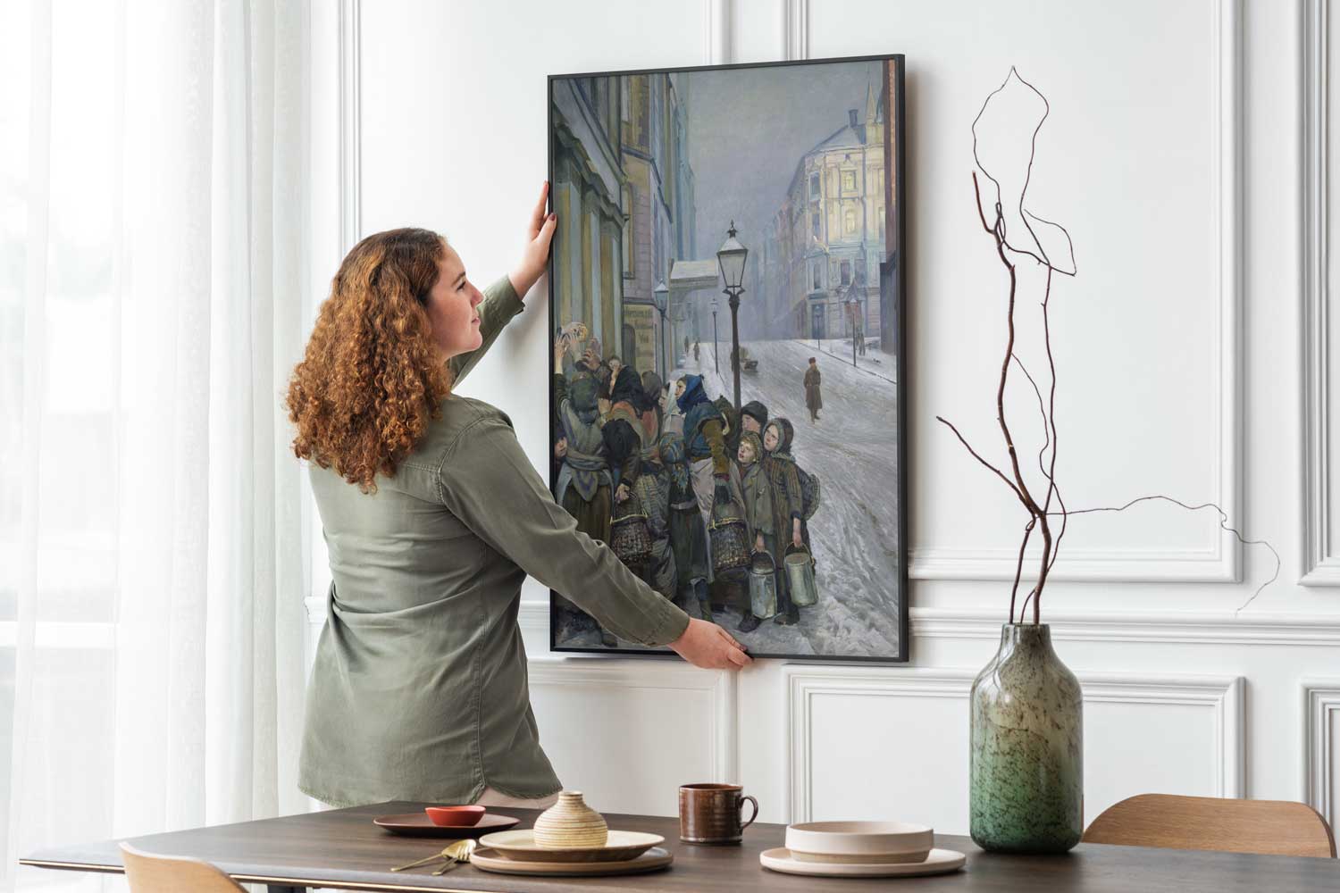 - Etter printing spennes lerretsduken på en kraftig blindramme. For de fleste formatene bruker vi en 40mm tykk ramme, slik at det oppnås en flott dybde-effekt når rammen henges på veggen. Deretter monterer vi på oppheng med stålvaier og kunstverket ditt kan henges rett på vegg.